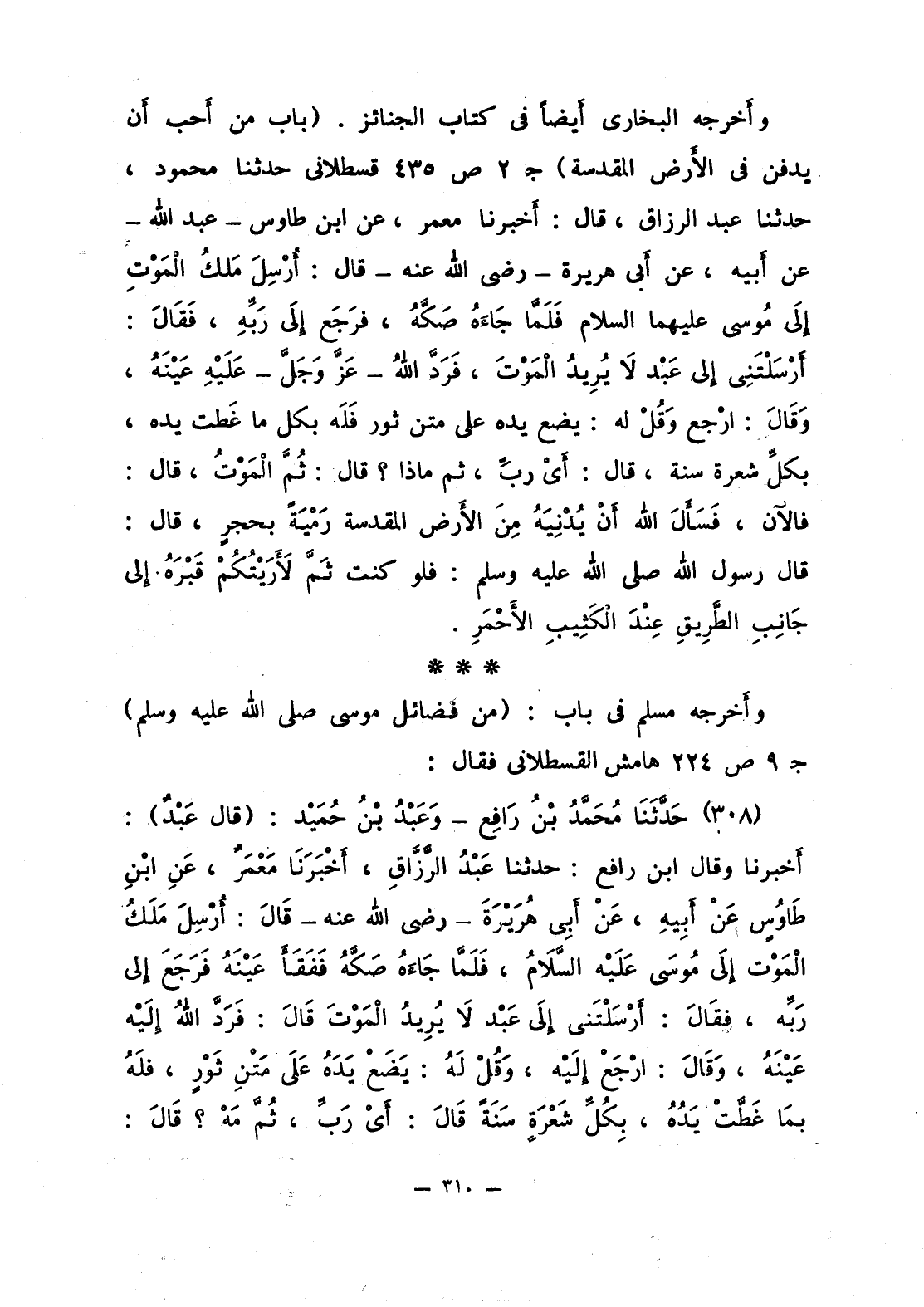 وأخرجه البخاري أيضا في كتاب الجنائز. (باب من أحب أن يدفن في الأرض المقدسة) ج - 2 ص 435 قسطلاني حدثنا محمود، حدثنا عبد الرزاق، قال: أخبرنا معمر، عن ابن طاوس - عبد الله - عن أبيه، عن أبي هريرة - رَضِيَ اللَّهُ عَنْه - قَالَ: أُرْسِلَ مَلكُ الْمَوْتِ إلَى مُوسَى عليهما السلام فلمَّا جَاءَهُ صَكَّهُ، فرجَعَ إلى رَبِّهِ، فَقَالَ: أَرْسَلْتَني إلى عَبْد لاَ يُرِيدُ الْمَوْتَ، فَرَدَّ اللَّهُ - عَزَّ وَجَلَّ - عَلَيْهِ عَيْنَهُ، وَقَالَ: ارْجع وقُلْ له: يضع يده على متن ثور فَلَه بكل ما غَطت يده، بكلِّ شعرة سنة، قَالَ: أَيْ ربِّ، ثم ماذا؟ قَالَ: ثُمَّ الْمَوْتُ، قَالَ: فالآن، فَسَأَل الله أنْ يُدْنيَهُ مِنَ الأَرض المقدسة رَميةً بحجرٍ، قَالَ: قال رَسُولُ اللَّهِ صلى الله عليه وسلّم: «فلو كنت ثَمَّ لأَرَيْتُكُمْ قَبَرْهُ إلى جانِبِ الطَّرِيقِ عِندَ الكَثِيبِ الأحْمَرِ».