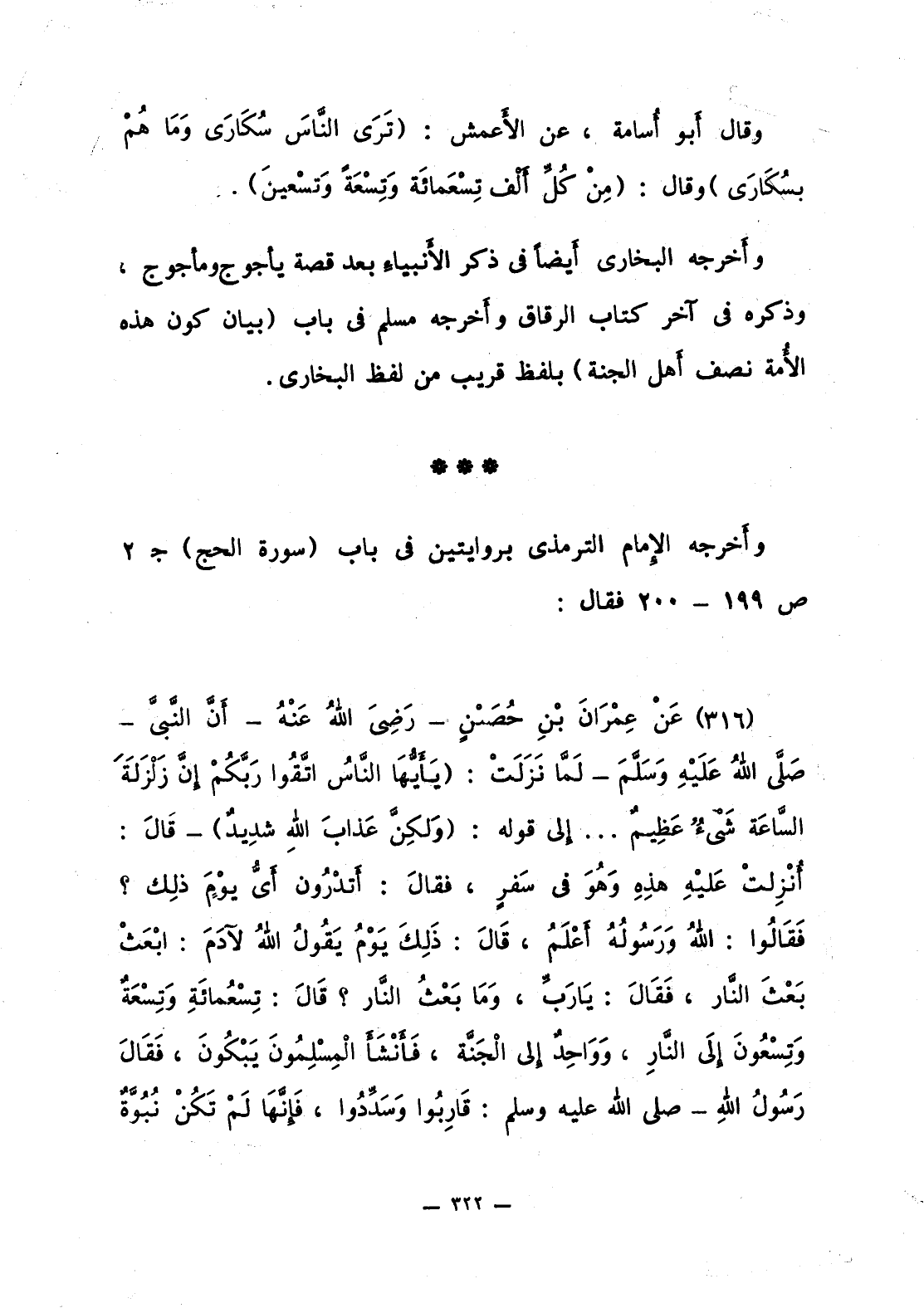 317 - عَنْ عِمْرَانَ بْنِ حُصَيْنٍ - رَضِيَ اللَّهُ عَنْهُ - أَنَّ النَّبِيِّ صلى الله عليه وسلم لَمَّا نَزَلَتْ: {يأَيُّهَا النَّاسُ اتَّقُواْ رَبَّكُمْ إِنَّ زَلْزَلَةَ السَّاعَةِ شَيْءٌ عَظِيمٌ} ... إلى قوله: {وَلَكِنَّ عَذَابَ اللَّهِ شَدِيدٌ} - قَالَ: أُنْزِلتْ عَليْهِ هذِهِ وَهُوَ في سَفرٍ، فقالَ: «أَتدْرُون أَيُّ يَوْم ذلك»؟ فقالوا: اللَّهُ ورَسُولُهُ أَعْلَمُ، قَالَ: «ذَلِكَ يَوْمُ يَقُولُ اللَّهِ لآدَمَ: ابْعَثْ بَعْثَ النَّار، فَقَالَ: يَا رَبِّ، وَمَا بَعْثُ النَّار؟ قَالَ: تِسْعُمائَةِ وتِسْعَةٌ وتِسْعُونَ إلَى النَّارِ، وَوَاحِدٌ إلَى الْجَنَّةِ»، فَأَنْشَأَ المُسْلِمُونَ يَبْكُونَ، فَقالَ رَسُولُ اللَّهِ صلى الله عليه وسلّم: «قَارِبُوا وسَدِّدُوا، فَإنَّهَا لَمْ تَكُنْ نُبُوَّةٌ