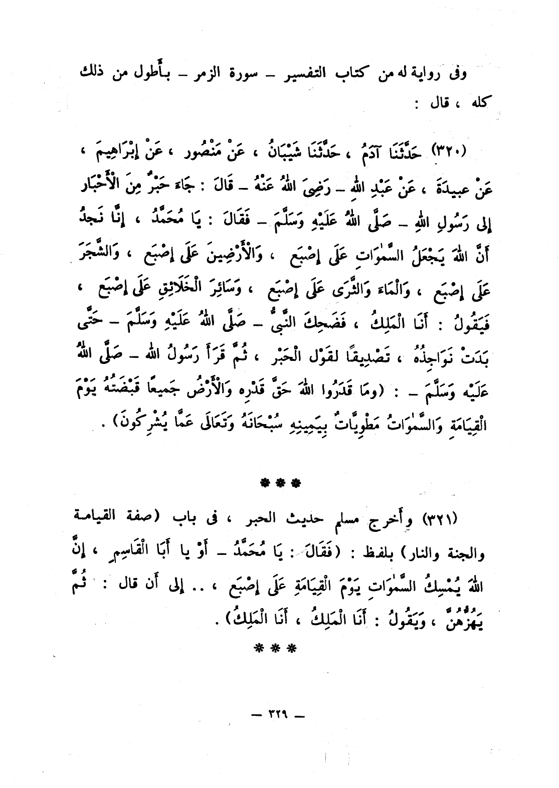 321 - حَدَّثَنَا آدَمُ، حَدَّثَنَا شَيْبَانُ، عَنْ مَنْصُور، عَنْ إبْرَاهِيمَ، عَنْ عبيدَةَ، عَنْ عَبْدِ اللَّهِ - رَضِيَ اللَّهُ عَنْهُ - قَالَ: جَاءَ حَبْرٌ مِنَ الأَحْبَار إلى رَسُولِ اللَّهِ فَقَالَ: يَا مُحَمَّدُ، إنَّا نَجِدُ أَنَّ اللَّهَ يَجْعَلُ السَّموَاتِ عَلَى إصْبَع، والأَرْضِينَ عَلَى إصْبَع، والشَّجَرَ عَلَى إصْبَع، وَالْمَاءَ والثَّرَى عَلَى إصْبَع، وَسَائِرَ الْخَلاَئِقِ عَلَى إصْبَعٍ، فَيَقُولُ: أَنَا الْمَلِكُ، فَضَحِكَ النَّبيُّ حَتَّى بَدَتْ نَوَاجِذُهُ، تَصْدِيقا لِقَوْل الْحَبْر، ثُمَّ قَرَأَ رَسُولُ اللَّهِ صلى الله عليه وسلّم: {وَمَا قَدَرُواْ اللَّهَ حَقَّ قَدْرِهِ وَالأَرْضُ جَمِيعاً قَبْضَتُهُ يَوْمَ الْقِيَامَةِ وَالسَّمَاوَاتُ مَطْوِيَّاتٌ بِيَمِينِهِ سُبْحَانَهُ وَتَعَالَى عَمَّا يُشْرِكُونَ}.