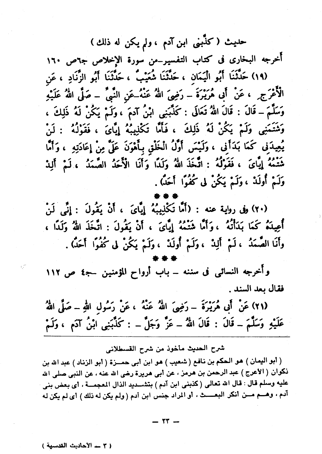 20 - وفي رواية عنه: «أَمَّا تَكْذِيبُهُ إيَّايَ، أَنْ يَقُولَ: إنِّي لَنْ أُعِيدَهُ كَمَا بَدَأْتُهُ، وَأَمَّا شَتْمُهُ إيَّايَ، أَنْ يَقُولَ: اتَّخَذَ اللَّهُ وَلَدا، وأَنَا الصَّمَدُ، لَمْ أَلِدْ، وَلَمْ أُولَدْ، وَلَمْ يَكُنْ لي كُفُوا أَحَدٌ».