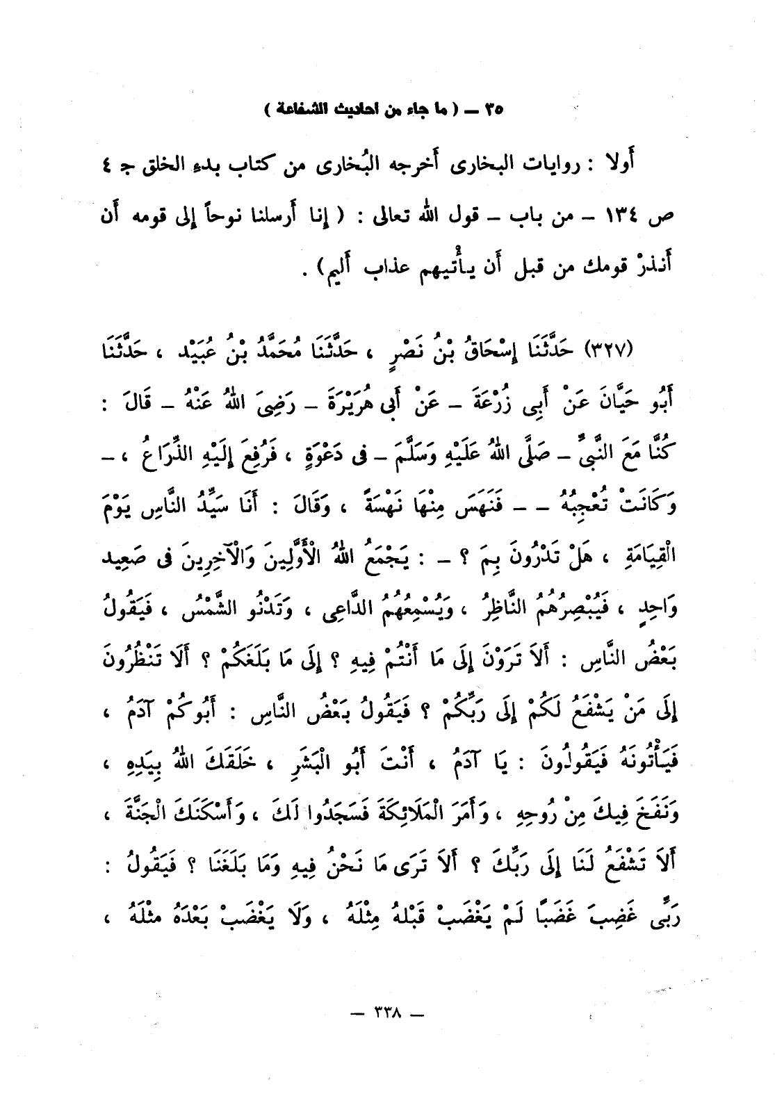 328 - حَدَّثَنَا إسْحَاقُ بْنُ نَصْرٍ، حَدَّثَنَا مُحَمَّدُ بْنُ عُبَيْد، حَدَّثَنَا أَبُو حَيَّانَ عَنْ أَبِي زُرْعَةَ - عَنْ أَبي هُرَيْرَةَ - رَضِيَ اللَّهُ عَنْهُ - قَالَ: كُنَّا مَعَ النَّبيِّ في دَعْوَةٍ، فَرُفِعَ إلَيْهِ الذِّراعُ، - وكَانَتْ تَعّجِبُهُ - فَنَهَسَ مِنْهَا نَهْسَةً، وقَالَ: «أَنَا سَيِّدُ النَّاسِ يَوْمَ الْقِيَامَةِ، هَلْ تَدْرُونَ بِمَ؟» -: يَجْمَعُ اللَّهُ الأَوَّلِينَ وَالآخِرِينَ في صَعِيد وَاحِدٍ، فيُبْصِرُهُمُ النَّاظِرُ، وَيُسْمِعُهُمُ الدَّاعِي، وَتَدْنُو الشَّمْسُ، فَيَقُولُ بَعضُ النَّاسِ: أَلاَ تَرَوْنَ إلَى مَا أَنتُمْ فِيهِ؟ إلَى مَا بَلَغَكُمْ؟ أَلاَ تَنْظُرُونَ إلَى مَنْ يَشْفَعُ لَكُمْ إلَى رَبِّكُمْ؟ فَيَقُولُ بَعْضُ النَّاسِ: أَبُوكُمْ آدَمُ، فَيَأْتُونَهُ فَيَقُولُونَ: يَا آدَمُ، أَنْتَ أَبُو الْبَشَرِ، خَلَقَكَ اللَّهُ بِيَدِهِ، وَنَفَخَ فِيكَ مِنْ رُوحِهِ، وَأَمَرَ الْمَلاَئِكَةَ فَسَجَدُوا لَكَ، وَأَسْكَنَكَ الْجَنَّةَ، أَلاَ تشْفَعُ لَنَا إلَى رَبِّكَ؟ أَلاَ تَرَى ما نَحْنُ فِيهِ وَمَا بَلَغَنَا؟ فَيَقُولُ: رَبِّي غَضِبَ غَضَبا لَمْ يَغْضَبْ قَبْلَهُ مِثْلَهُ، وَلاَ يَغْضَبْ بَعْدَهُ مِثْلَهُ،