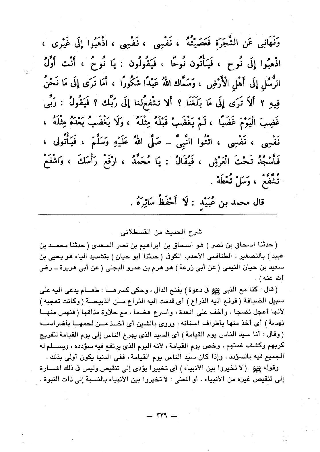 وَنَهَاني عَنِ الشَّجَرَةِ فَعَصَيْتُهُ، نَفْسِي، نَفْسِي، اذْهَبُوا إلَى غَيْري، اذْهبُوا إلى نْوح، فَيأْتُون نُوحا، فَيَقولُونَ: يَا نُوحُ، أَنْت أَوَّلُ الرُّسُلِ إلَى أَهْلِ الأَرْضِ، وسَمَّاك اللَّهُ عَبْدا شَكُورا، أَمَا تَرَى إلى مَا نَحْنُ فِيهِ؟ أَلاَ تَرَى إلى ما بَلَغَنا؟ أَلا تشْفعُ لنا إلَى رَبِّك؟ فَيَقُولُ: رَبِّي غَضِبَ الْيَوْمَ غَضَبا، لَمْ يَغْضَبْ قَبْلَهُ مِثْلَهُ، وَلاَ يَغْضَبُ بَعْدَهُ مِثْلَهُ، نَفْسي، نَفْسي، ائْتُوا النَّبِيِّ صلى الله عليه وسلم، فيَأْتُوني، فَأَسْجُدُ تَحْتَ العَرْش، فيُقالُ: يا مُحَمَّدُ، ارْفَعْ رَأْسَك، وَاشْفَعْ تُشَفَّعْ، وَسَلْ تُعْطَهْ».