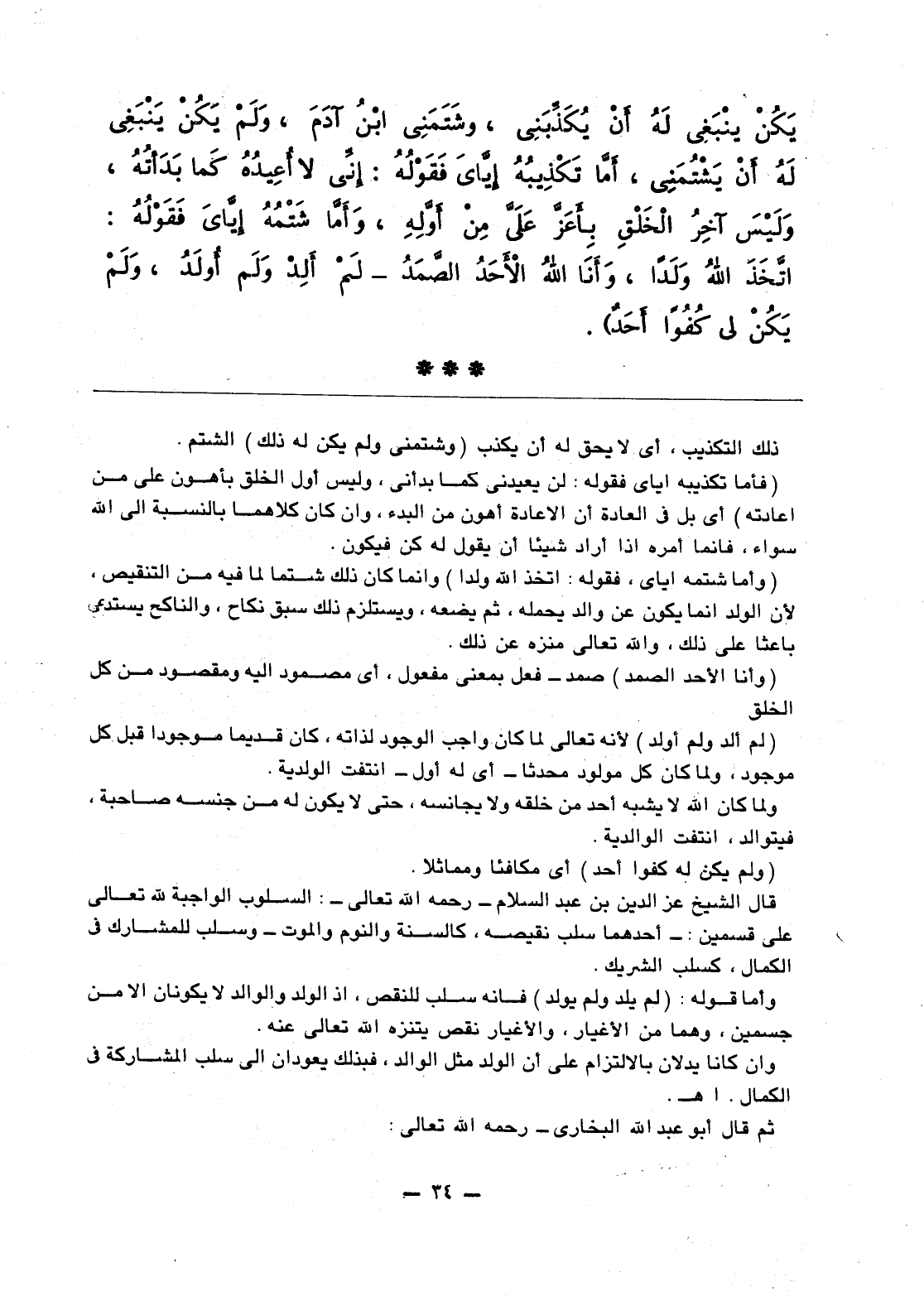 يَكُنْ يَنْبَغِي لَهُ أَنْ يُكَذِّبَنِي، وشَتَمَنِي ابْنُ آدَمَ، وَلَمْ يَكُنْ يَنْبَغِي لَهُ أَنْ يَشْتُمَنِي، أَمَّا تَكْذِيبُهُ إيَّايَ فَقَوْلُهُ: إنِّي لا أُعِيدُهُ كَما بَدَأْتُهُ، وَلَيْسَ آخِرُ الْخَلْقِ بِأَعَزَّ عَلَيَّ مِنْ أَوَّلِهِ، وَأَمَّا شَتْمُهُ إيَايَ فَقَوْلُهُ: اتَّخَذَ اللَّهُ وَلَدا، وَأَنَا اللَّهُ الأَحَدُ الصَّمَدُ - لَمْ أَلِدْ وَلَمْ أُولَدْ، وَلَمْ يَكُنْ لي كُفُوا أَحَدٌ».