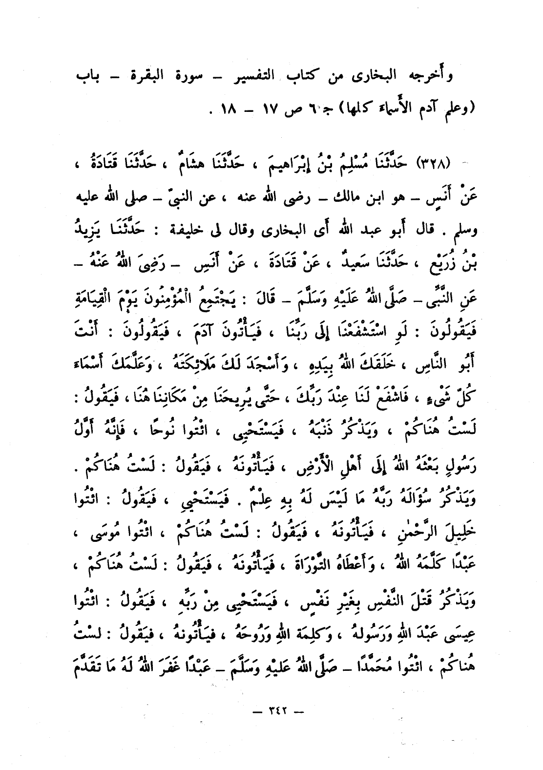 329 - حَدَّثَنَا مُسْلِمُ بْنُ إبْرَاهيمَ، حَدَّثَنَا هشامٌ، حَدَّثَنَا قَتادَةُ، عَن أَنسٍ - هو ابن مالك - رَضِيَ اللَّهُ عَنْه، عن النَّبيِّ قال أبو عبد الله أي البخاري وقال لي خليفة: حَدَّثَنَا يَزِيدُ بْنُ زُرَيْع، حَدَّثَنَا سعيدٌ، عَن قَتادَةَ، عَن أَنس - رَضِيَ اللَّهُ عَنْهُ - عَنِ النَّبيِّ قَالَ: «يَجْتَمِعُ المُؤمِنونَ يَومَ القِيامَةِ فَيَقولُونَ: لَوِ اسْتَشْفَعْنا إلَى رَبِّنا، فَيَأْتُونَ آدَمَ، فَيَقُولُونَ: أَنتَ أَبُو النَّاسِ، خَلَقَكَ اللَّهُ بِيَدِه، وَأَسْجَدَ لَكَ ملائِكَتَهُ، وعَلَّمَكَ أَسْماءَ كُلّ شَيءٍ، فَاشْفَعْ لَنا عِندَ رَبِّكَ، حَتَّى يُرِيحَنا مِن مَكانِنا هُنا، فَيقُولُ: لَستُ هُناكُم، ويَذْكُرُ ذَنبَهُ، فَيَسْتَحْيِي، ائتوا نوحا، فإنَّه أَوَّلُ رسولٍ بعثَهُ اللَّهُ إلى أهْلِ الأَرْضِ، فَيَأتونَه، فَيقولُ: لَستُ هُناكُمْ. ويَذْكُرُ سُؤالَهُ رَبَّهُ ما لَيْس لَهُ بِه عِلْمٌ. فَيَسْتَحْيِي، فَيَقولُ: ائْتُوا خَلِيلَ الرَّحمنِ، فَيأتُونَهُ، فَيقُولُ: لَستُ هُناكُم، ائُتُوا مُوسَى، عَبْدا كَلَّمَهُ اللَّهُ، وأعطاهُ التَّوراةَ، فَيَأتونَهُ، فيَقولُ: لَستُ هُناكُمْ، ويَذْكُرُ قَتلَ النَّفسِ بِغيرِ نَفْسٍ، فيَسْتَحْيِي مِن ربِّهِ، فيقول: ائْتُوا عِيسَى عَبْدَ اللَّهِ ورَسُولهُ، وكلِمَة اللَّهِ ورُوحَهُ، فيَأتونهُ، فيَقولُ: لسْتُ هُناكُمْ، ائْتُوا مُحَمَّدا عَبْدا غَفَرَ اللهُ لَهُ ما تقَدَّمَ