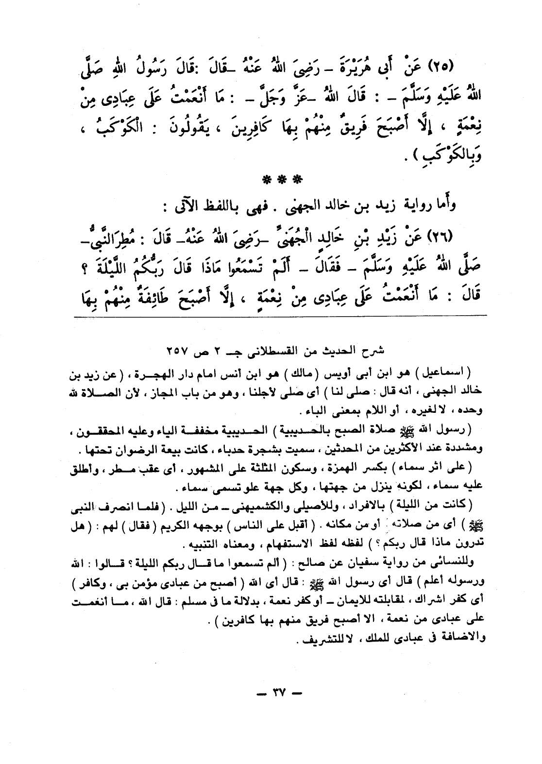 25 - عَنْ أَبي هُرَيْرَةَ - رَضِيَ اللَّهُ عَنْهُ - قَالَ: قَالَ رَسُولُ اللَّهِ صلى الله عليه وسلّم: «قَالَ اللَّهُ - عَزَّ وَجَلَّ -: مَا أَنْعَمْتُ عَلَى عِبَادِي مِنْ نِعْمَةٍ، إلاَّ أَصْبَحَ فَرِيقٌ مِنْهُمْ بِهَا كَافِرِينَ، يَقُولُونَ: الْكَوْكَبُ، وَبِالْكَوْكَبِ».