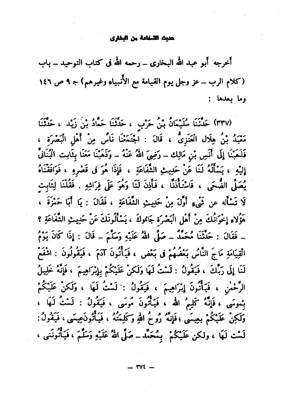 338 - حَدَّثَنَا سُلَيْمَانُ بْنُ حَرْبٍ، حَدَّثَنَا حَمَّادُ بْنُ زَيْد، حَدَّثَنَا مَعْبَدُ بْنُ هِلاَل الْعَنَزِيُّ، قَالَ: اجْتَمَعْنا نَاسٌ مِنْ أَهْلِ البَصْرَةِ، فَذَهَبْنا إلَى أَنَسِ بْنِ مالِك - رَضِيَ اللَّهُ عَنْهُ - وذَهَبْنا مَعَنَا بِثابت الْبُنانيِّ إلَيْهِ، يَسْأَلُهُ لَنَا عَنْ حَدِيثِ الشَّفاعَةِ، فَإذَا هُوَ في قَصْرِهِ، فَوَافَقْناهُ يُصَلِّي الضُّحَى، فَاسْتَأذَنَّا، فأَذِنَ لَنا وَهُوَ عَلى فِراشِهِ. فقُلْنا لِثابِتٍ لاَ تَسأَله عن شيْءٍ أوَّلَ مِن حَديثِ الشَّفاعَةِ، فَقَالَ: يَا أَبَا حَمْزَةَ، هَؤلاَءِ إخْوانُكَ مِن أهْل البَصْرَةِ جَاءُوكَ، يَسْأَلُونَكَ عَن حَدِيثِ الشَّفاعَةِ؟ فَقَالَ: حَدَّثَنَا مُحَمَّدٌ قَالَ: «إذَا كانَ يَوْمُ القِيامَةِ مَاجَ النَّاسُ بَعْضُهُمْ في بَعْض، فَيَأْتُونَ آدَمَ، فَيَقُولُونَ: اشْفَعْ لَنا إلَى رَبِّكَ، فَيَقُولُ: لَسْتُ لَها ولَكنْ عَلَيْكُمْ بإبْراهِيمَ، فإنَّهُ خَلِيلُ الرَّحْمنِ، فَيَأْتُونَ إبراهيمَ، فيَقُولُ: لَستُ لَها، ولَكِنْ عَلَيْكُمْ بِموسَى، فإنَّهُ كَلِيمُ الله، فَيَأْتُونَ مُوسَى، فَيَقُولُ: لَسْتُ لَها، ولَكِنْ عَلَيْكُمْ بعِيسَى؛ فإنَّهُ رُوحُ اللَّهِ وَكَلِمَتُهُ، فَيَأْتُونَ عِيسَى، فيَقُولُ: لَسْتَ لَها، ولكن عَلَيْكُم بِمُحَمَّد، فَيَأْتُونَني،