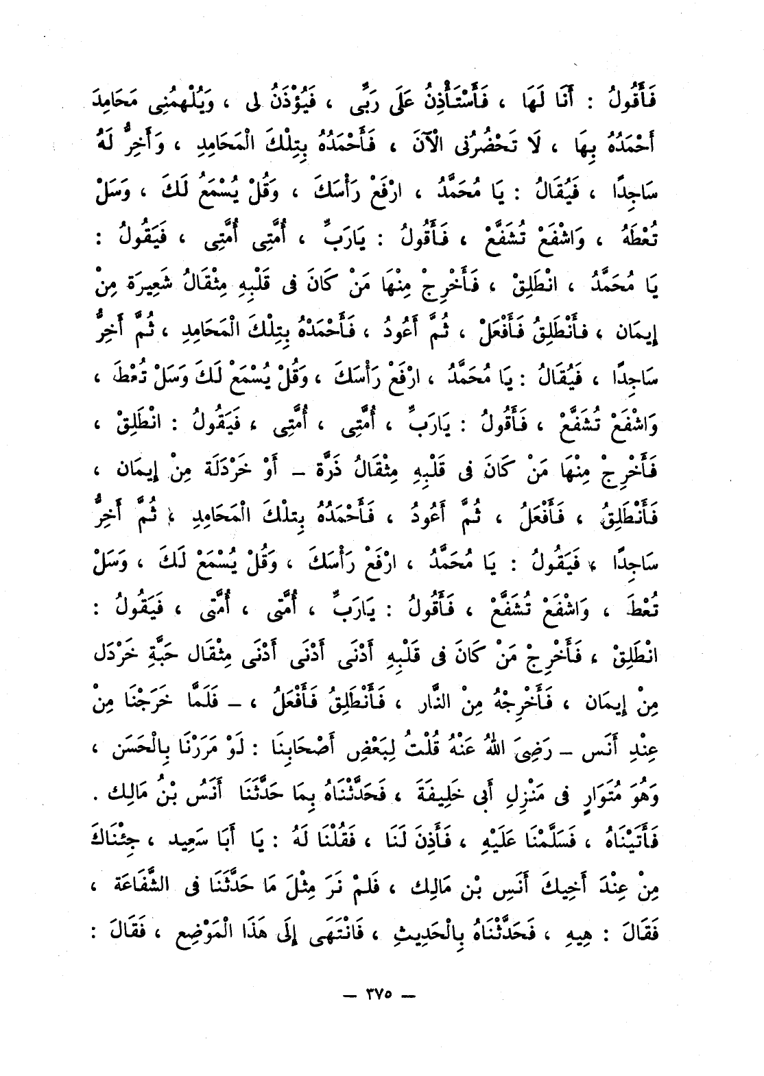 فأَقُولُ: أنَا لَها، فأَسْتَأْذِنُ علَى رَبِّي، فَيُؤذَنُ لي، وَيُلْهِمُني مَحَامِدَ أَحْمَدُهُ بِها، لاَ تَحْضُرُني الآنَ، فَأَحْمَدُهُ بِتِلْكَ المَحَامِدِ، وأَخِرُّ لَهُ ساجِدا، فيُقالُ: يَا مُحَمَّدُ، ارْفَعْ رَأسَكَ، وَقُلْ يُسْمَعُ لَكَ، وَسَلْ تُعْطَهُ، وَاشْفَعْ تُشَفَّعْ، فأقُولُ: يَا رَبِّ، أُمَّتي أُمَّتي، فَيَقولُ: يا مُحَمَّدُ، انْطَلِقْ، فأَخْرِجْ مِنهَا مَنْ كانَ في قَلْبِهِ مِثْقالُ شَعِيرَة مِنْ إيمَان، فأَنْطَلِقُ فَأَفْعَلْ، ثُمَّ أَعُودُ، فأَحْمَدْهُ بِتِلْكَ الْمَحَامِدِ، ثُمَّ أَخِرُّ سَاجِدا، فَيُقَالُ: يا مُحَمَّدُ، ارْفَعْ رَأسَكَ، وَقُلْ يُسْمَعْ لَكَ وسَلْ تُعْطَ، وَاشْفَعْ تُشَفَّعْ، فأقُولُ: يَا رَبِّ، أُمَّتي، أُمَّتي، فَيَقُولُ: انْطَلِقْ، فَأَخْرِجْ مِنْها مَنْ كانَ في قَلْبِهِ مِثقالُ ذَرَّة - أَوْ خَرْدَلَة مِن إيمَان، فَأَنْطَلِقُ، فَأَفْعَلُ، ثُمَّ أَعُودُ، فَأَحْمَدُهُ بِتِلْكَ الْمَحامِدِ، ثُمَّ أَخِرُّ سَاجِدا، فَيَقُولُ: يا مُحَمَّدُ، ارْفَعْ رَأْسَكَ، وَقُلْ يُسْمَعْ لَكَ، وَسَلْ تُعْطَ، وَاشْفَعْ تُشَفَّعْ، فَأَقُولُ: يَا رَبِّ، أُمَّتي، أُمَّتي، فَيَقُولُ: انْطَلِقْ، فَأَخْرِجْ مَن كانَ في قَلْبِهِ أَدْنَى أَدْنَى مِثْقالَ حَبَّةِ خَرْدَل مِن إيمان»، فأخْرِجْهُ مِنَ النَّار، فأنْطَلِقُ فأَفْعَلُ»، - فلَمَّا خَرَجْنا مِنْ عِنْدِ أنَس - رَضِيَ اللَّهُ عَنْهُ - قُلتُ لِبَعْضِ أَصْحَابِنا: لَوْ مَرَرْنا بِالْحَسَنِ، وَهُوَ مُتَوَارٍ في مَنْزِلِ أبي خَلِيفَةَ، فَحَدَّثْناهُ بِمَا حَدَّثَنا أَنَسُ بْنُ مَالِك. فَأَتَيْنَاهُ، فَسلَّمْنا عَلَيْهِ، فَأَذِنَ لَنا، فَقُلْنا لَهُ: يَا أَبَا سَعِيد، جِئْناكَ مِنْ عِنْدَ أخِيك أنَسِ بْن مالِك، فلَمْ نَرَ مِثْلَ ما حَدَّثَنَا في الشَّفاعَة، فَقَالَ: هِيهِ، فَحَدَّثْناهُ بِالحَدِيثِ، فَانْتَهَى إلى هَذَا الْمَوْضِع،