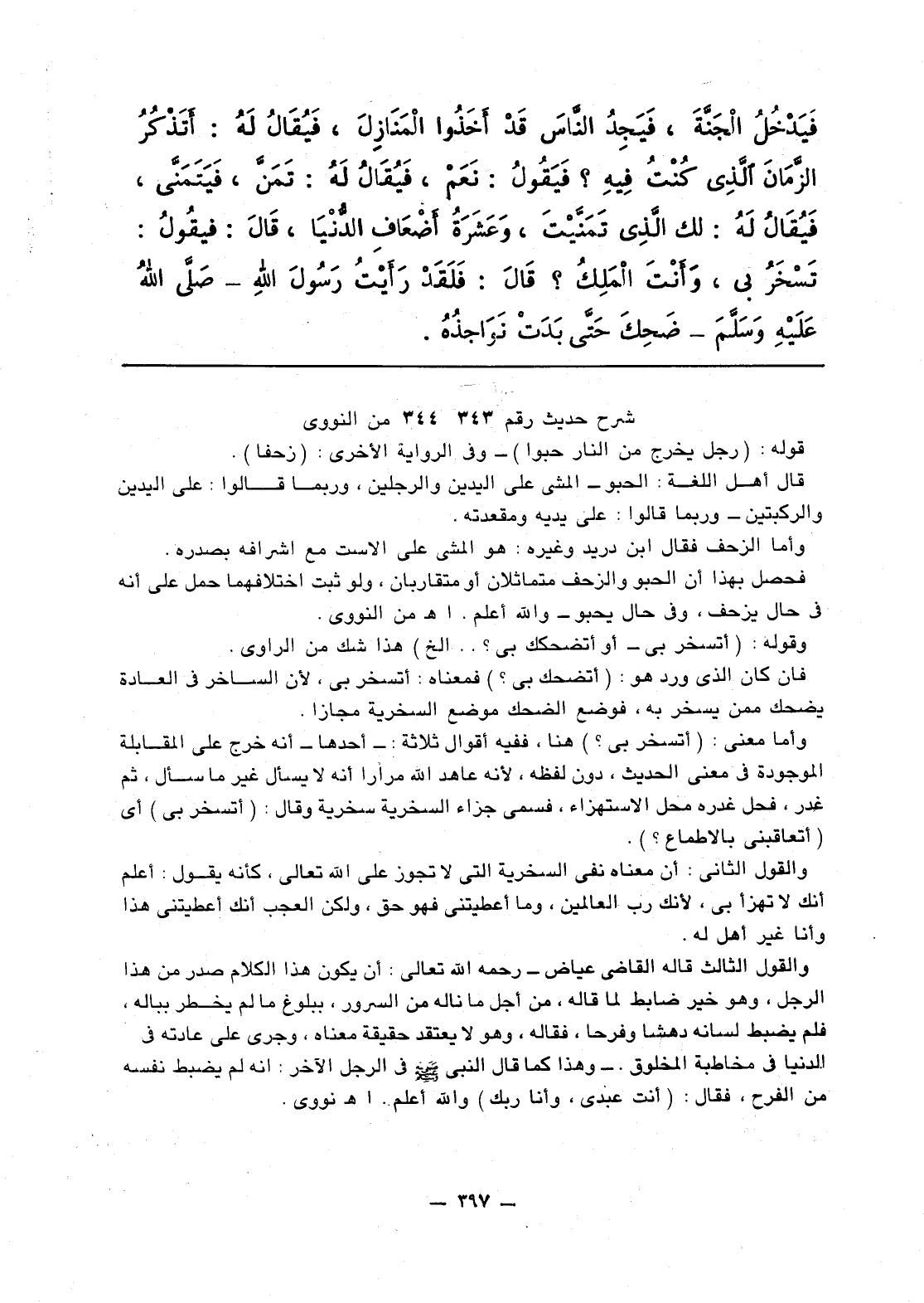 فَيَدْخُلُ الجَنَّةَ، فَيَجِدُ النَّاسَ قَدْ أَخَذوا المَنازِلَ، فيُقَالُ لَهُ: أَتَذْكُرُ الزَّمانَ الَّذي كُنْتُ فِيهِ؟ فَيَقولُ: نَعَمْ، فَيُقالُ لَهُ: تَمَنَّ، فَيَتَمَنَّى، فَيُقالُ لَهُ: لك الَّذي تَمَنَّيْتَ، وعَشَرَةُ أَضعافِ الدُّنْيا، قَالَ: فيقُولُ: تَسْخَرُ بي، وأنْتَ المَلِكُ؟» قَالَ: فَلَقَدْ رَأَيْتُ رَسُوُلُ اللَّهِ ضَحِكَ حَتَّى بَدَتْ نَوَاجِذُهُ.
