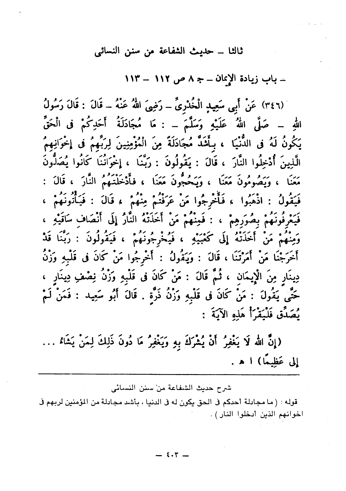 347 - عَنْ أَبِي سَعِيدٍ الْخُدْرِيِّ - رَضِيَ اللَّهُ عَنْهُ - قَالَ: قالَ رَسُولُ اللَّهِ صلى الله عليه وسلّم: «مَا مُجَادَلَةُ أَحَدِكُمْ في الْحَقِّ يَكُونُ لَهُ في الدُّنْيَا، بِأَشَدَّ مُجَادَلَةً مِنَ الْمؤمِنِينَ لِرَبِّهِمْ في إخْوَانِهِمُ الَّذِينَ أُدْخِلُوا النَّارَ، قَالَ: يَقُولُونَ: رَبَّنَا، إخْوَانُنَا كَانُوا يُصَلُّونَ مَعَنَا، وَيَصُومُونَ مَعَنَا، وَيَحُجُّونَ مَعَنَا، فأَدْخَلْتَهُمُ النَّارَ، قَالَ: فَيَقُولُ: اذْهَبُوا، فَأَخْرجُوا مَنْ عَرَفْتُمْ مِنْهُمْ، قَالَ: فَيَأْتُونَهُمْ، فَيَعْرِفُونَهُمْ بِصُوَرِهِمْ، فَمِنْهُمْ مَنْ أَخَذَتْهُ النَّارُ إلَى أَنْصَافِ سَاقَيْهِ، وَمِنْهُمْ مَنْ أَخَذَتْهُ إلَى كَعْبَيْهِ، فَيُخْرِجُونَهُمْ، فَيَقُولُونَ: رَبَّنا قَدْ أَخْرَجْنَا مَنْ أَمَرْتَنا، قَالَ: وَيَقُولُ: أَخْرِجُوا مَنْ كانَ في قَلْبِهِ وَزْنُ دِينَارٍ مِنَ الإيمَانِ، ثُمَّ قَالَ: مَنْ كانَ في قَلْبِهِ وَزْنُ نِصْفِ دِينَارٍ، حَتَّى يَقُولَ: مَنْ كانَ في قَلْبِهِ وَزْنُ ذَرةٍ». قالَ أَبُو سَعِيد: فَمَنْ لَمْ يُصَدِّق فَلْيَقْرَأْ هَذِهِ الآيَةَ: