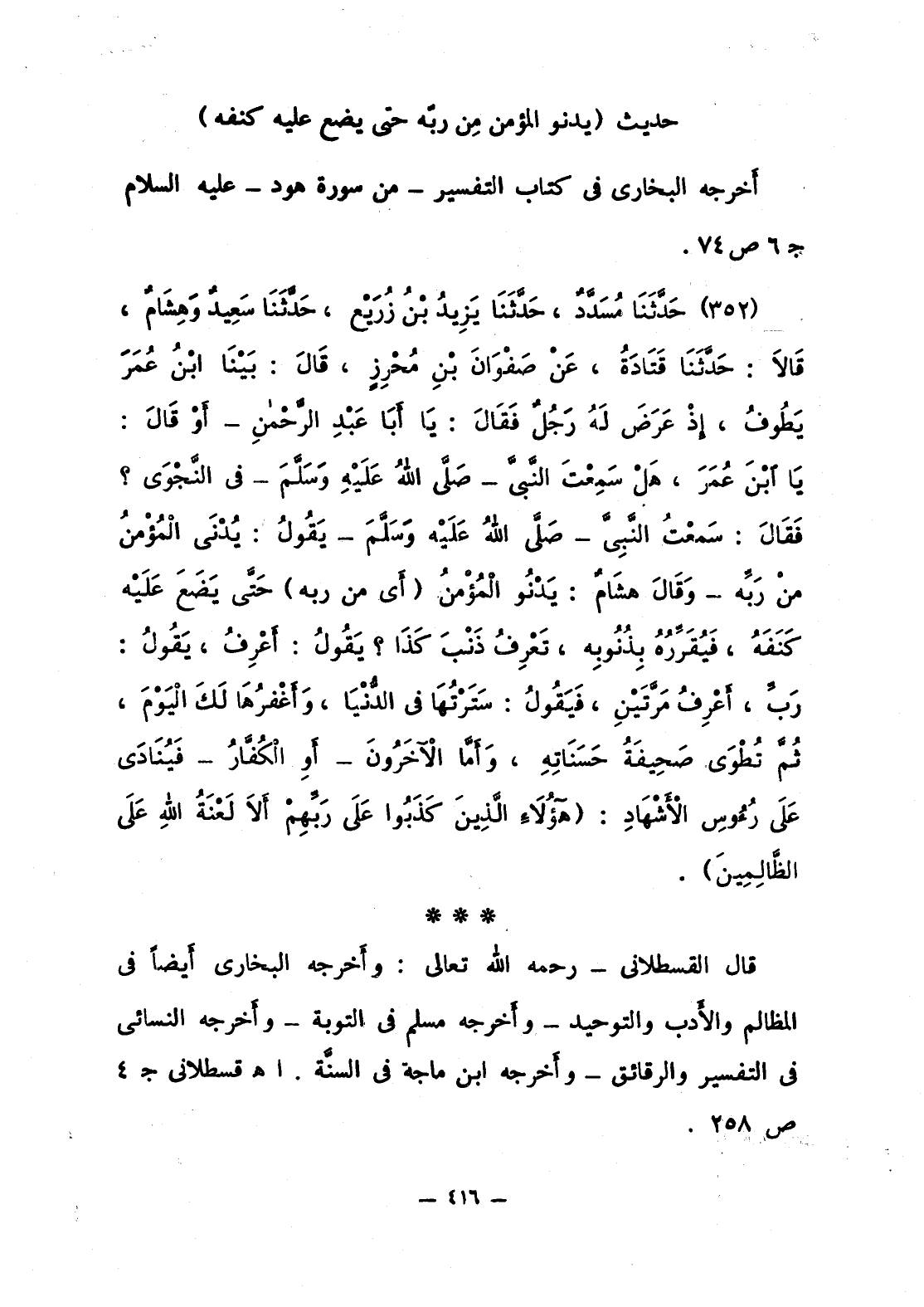 حديث (يدنو المؤمن من ربه حتى يضع عليه كنفه)