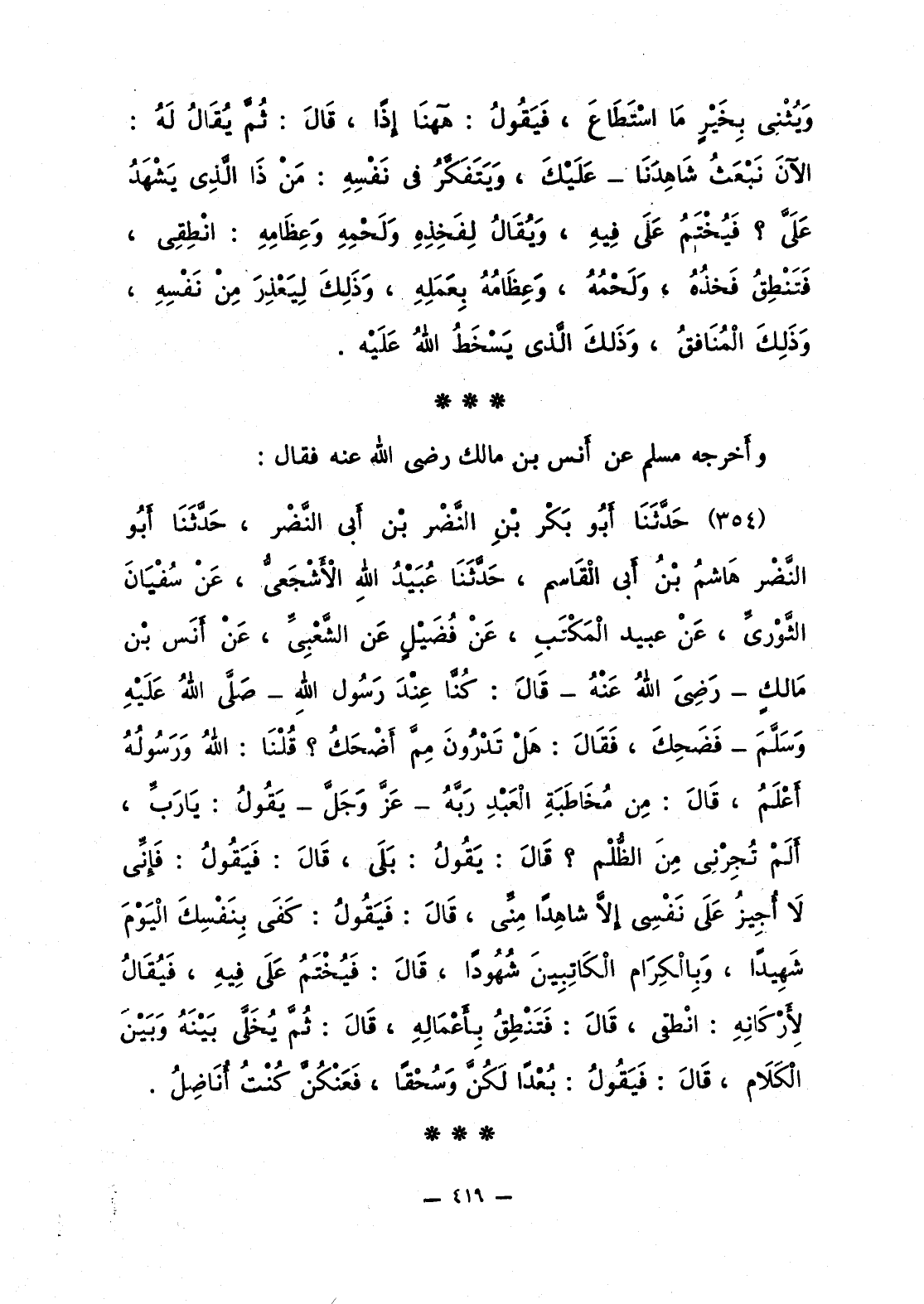 355 - حَدَّثَنَا أَبُو بَكْر بْنِ النَّضْر بْن أبي النَّضْر، حَدَّثَنَا أبُو النَّضْر هاشمُ بْنُ أَبي القَاسم، حَدَّثَنَا عُبَيْدُ اللَّهِ الأَشْجَعِيُّ، عَن سُفْيانَ الثَّوْريِّ، عَنْ عبيد الْمَكْتَبِ، عَنْ فُضَيْلٍ عَنِ الشَّعْبِيِّ، عَنْ أَنَس بْن مَالكٍ - رَضِيَ اللَّهُ عَنْهُ - قَالَ: كُنَّا عِنْدَ رَسُولِ اللَّهِ فَضَحِكَ، فَقَالَ: «هَلْ تُدْرُونَ مِمَّ أَضْحَكُ؟» قُلنا: اللَّهُ ورَسُولُهُ أَعْلَمُ، قَالَ: مِنْ مُخَاطَبَةِ الْعَبْدِ رَبَّهُ - عَزَّ وَجَلَّ - يَقُولُ: يَا رَبِّ، أَلَمْ تُجِزْني مِنَ الظُّلْمِ؟ قَالَ: «يَقُولُ: بَلَى، قَالَ: فَيَقُولُ: فَإنِّي لاَ أُجِيزُ عَلَى نَفْسِي إلاَّ شاهِدا مِني، قَالَ: فَيَقُولُ: كَفَى بَنَفْسِكَ اليَوْمَ شَهِيدا، وَبِالْكِرَام الكَاتِبِينَ شُهُودا، قَالَ: فَيُخْتَمُ عَلَى فِيهِ، فَيُقَالُ لأَرْكَانِهِ: انْطقي، قَالَ: فَتَنْطِقُ بِأَعْمالِهِ، قَالَ: ثُمَّ يُخَلَّى بَيْنَهُ وَبَيْنَ الْكَلاَم، قَالَ: فَيَقُولُ: بُعْدا لَكُنَّ وَسُحْقا، فَعَنْكُنَّ كُنْتُ أُناضِلُ».