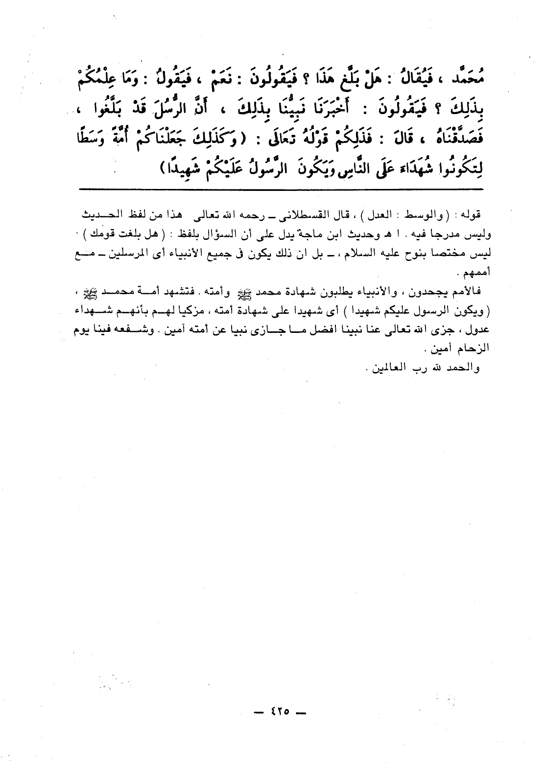 مُحَمَّد، فَيُقَالُ: هَلْ بَلَّغ هَذا؟ فَيَقُولُونَ: نَعَمْ، فَيَقُولُ: وَمَا عِلْمُكُمْ بِذَلِكَ؟ فَيَقُولُونَ: أَخْبَرَنَا نَبِيُّنا بِذَلِكَ، أَنَّ الرُّسُلَ قَدْ بَلَّغُوا، فَصَدَّقْنَاهُ، قَالَ: فَذَلِكُمْ قَوْلُهُ تَعَالَى: {وَكَذَلِكَ جَعَلْنَاكُمْ أُمَّةً وَسَطاً لِّتَكُونُواْ شُهَدَآءَ عَلَى النَّاسِ وَيَكُونَ الرَّسُولُ عَلَيْكُمْ شَهِيداً}.