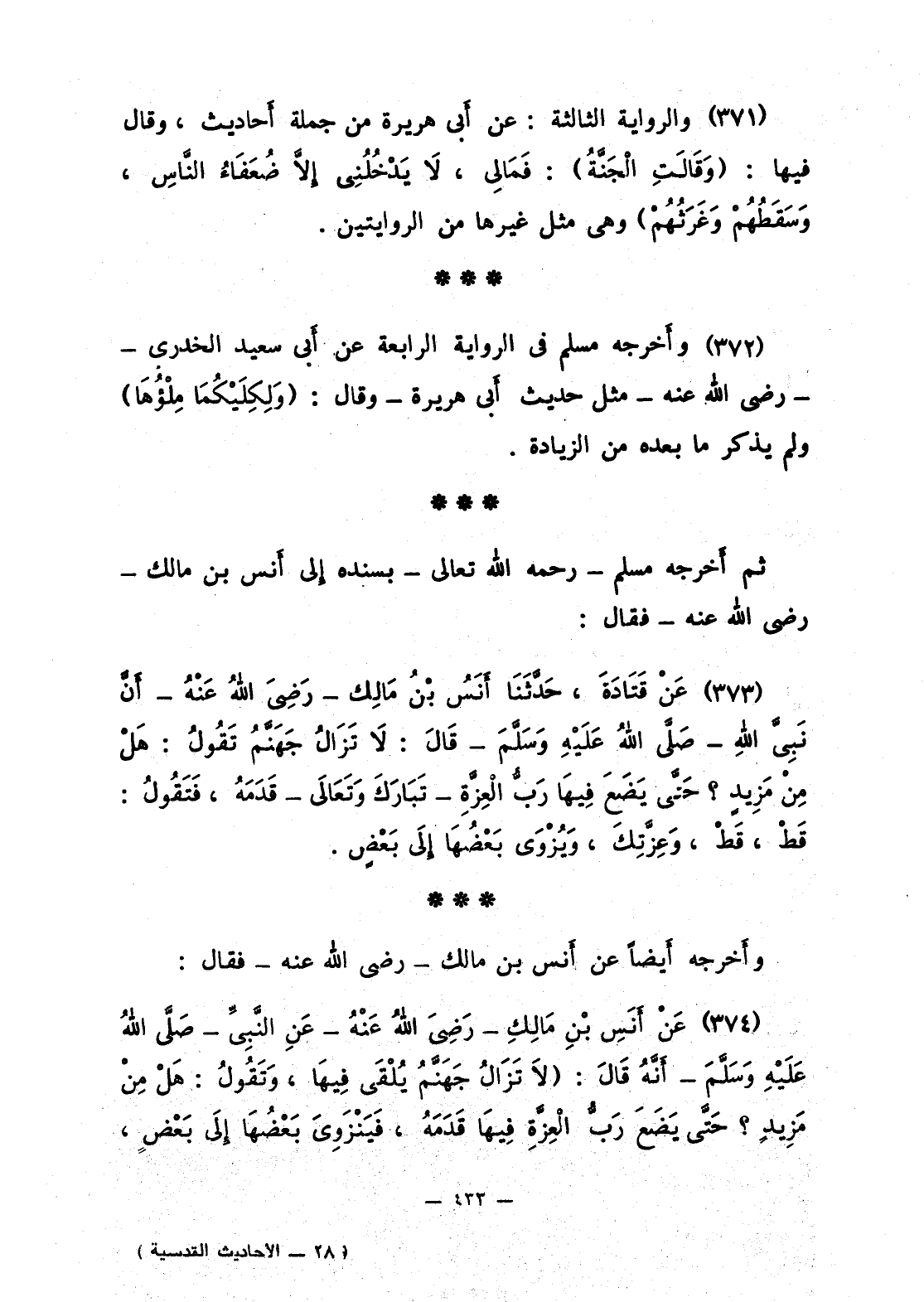375 - عَنْ أَنَسِ بْنِ مَالِكِ - رَضِيَ اللَّهُ عَنْهُ - عَنِ النَّبيِّ أَنَّه قالَ: «لاَ تَزَالُ جَهَنَّمُ يُلْقَى فِيهَا، وتَقُولُ: هَلْ مِنْ مَزِيدٍ؟ حَتَّى يَضَعَ رَبُّ العَزَّةِ فيهَا قَدَمَهُ، فَيَنْزَوِيَ بَعْضُهَا إلَى بَعْضٍ،