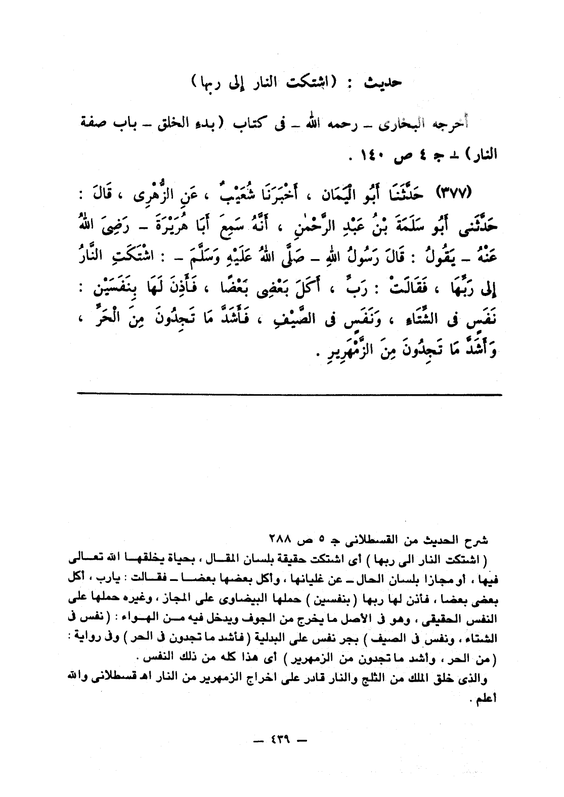 378 - حَدَّثَنَا أَبُو الْيَمَان، أَخْبَرَنَا شُعَيْبٌ، عَنِ الزُّهْرِي، قَالَ: حَدَّثَني أَبُو سَلَمَة بْنُ عَبْدِ الرَّحْمنِ، أَنَّهُ سَمِعَ أَبَا هُرَيْرَةَ - رَضِيَ اللَّهُ عَنْهُ - يَقُولُ: قالَ رَسُولُ اللَّهِ صلى الله عليه وسلّم: اشْتَكَتِ النَّارُ إلى رَبِّها، فَقَالَتْ: رَبِّ، أَكَلَ بَعْضي بَعْضا، فَأَذِنَ لَهَا بِنَفْسَيْن: نَفَسٍ في الشِّتاءِ، ونَفَسٍ في الصَّيْفِ، فَأَشَدَّ ما تَجِدُونَ مِنَ الْحَرِّ، وَأَشَدَّ مَا تَجِدُونَ مِنَ الزَّمْهَرِيرِ.