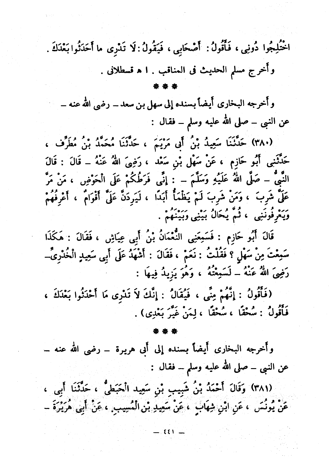 381 - حَدَّثَنَا سَعِيدُ بْنُ أَبي مَرْيَمَ، حَدَّثَنَا مُحَمَّدُ بْنُ مُطَرِّف، حَدَّثَني أَبُو حَازِم، عَنْ سَهْل بْنِ سَعْد، رَضِيَ اللَّهُ عَنْهُ - قَالَ: قَالَ النَّبيُّ: «إنِّي فَرَطُكُمْ عَلَى الْحَوْضِ، مَنْ مَرَّ عَلَيَّ شَرِبَ، وَمَنْ شَرِبَ لَمْ يَظْمأْ أَبَدا، لَيَرِدَنَّ عَلَيَّ أَقْوامٌ، أَعْرِفُهُمْ ويَعْرِفُونَني، ثُمَّ يُحَالُ بَيني وبَيْنَهُمْ».