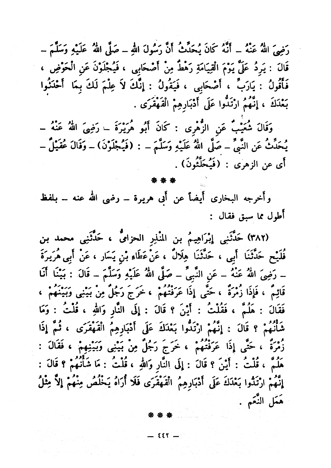 383 - حَدَّثَني إبْرَاهِيمُ بن المنْذِرِ الحزاميُّ، حَدَّثَني محمد بن فُلَيْح حَدَّثَنَا أَبِي، حَدَّثَنَا هِلاَلٌ، عَن عَطَاءِ بْنِ يَسَار، عَن أَبي هُرَيْرَةَ - رَضِيَ اللَّهُ عَنْهُ - عَنِ النَّبيِّ قَالَ: «بَيْنَا أَنَا قَائِمٌ، فَإذَا زُمْرَةٌ، حَتَّى إذَا عَرَفْتُهُمْ، خَرَجَ رَجُلٌ مِنْ بَيْني وبَيْنَهُمْ، فَقَالَ: هَلُمَّ، فَقُلْتُ: أَيْنَ؟ قَالَ: إلَى النَّارِ وَاللَّهِ، قُلْتُ: وَمَا شَأْنُهُمْ؟ قَالَ: إنَّهُمْ ارْتَدُّوا بَعْدَكَ عَلَى أَدْبَارِهِمْ الْقَهْقَرَى، ثُمَّ إذَا زُمْرَةٌ، حَتَّى إذَا عَرَفْتُهُمْ، خَرَجَ رَجُلٌ مِنْ بَيْني وبَيْنِهِمْ، فَقَالَ: هَلُمَّ، قُلْتُ: أَيْنَ؟ قَالَ: إلَى النَّارِ وَاللَّهِ، قُلْتُ: ما شَأْنُهُمْ؟ قَالَ: إنَّهُمْ ارْتَدُّوا بَعْدَكَ عَلَى أَدْبَارِهِمُ الْقَهْقَرَى فَلاَ أُرَاهُ يَخْلُصُ مِنْهُمْ إلاَّ مِثْلُ هَمَل النَّعَم».