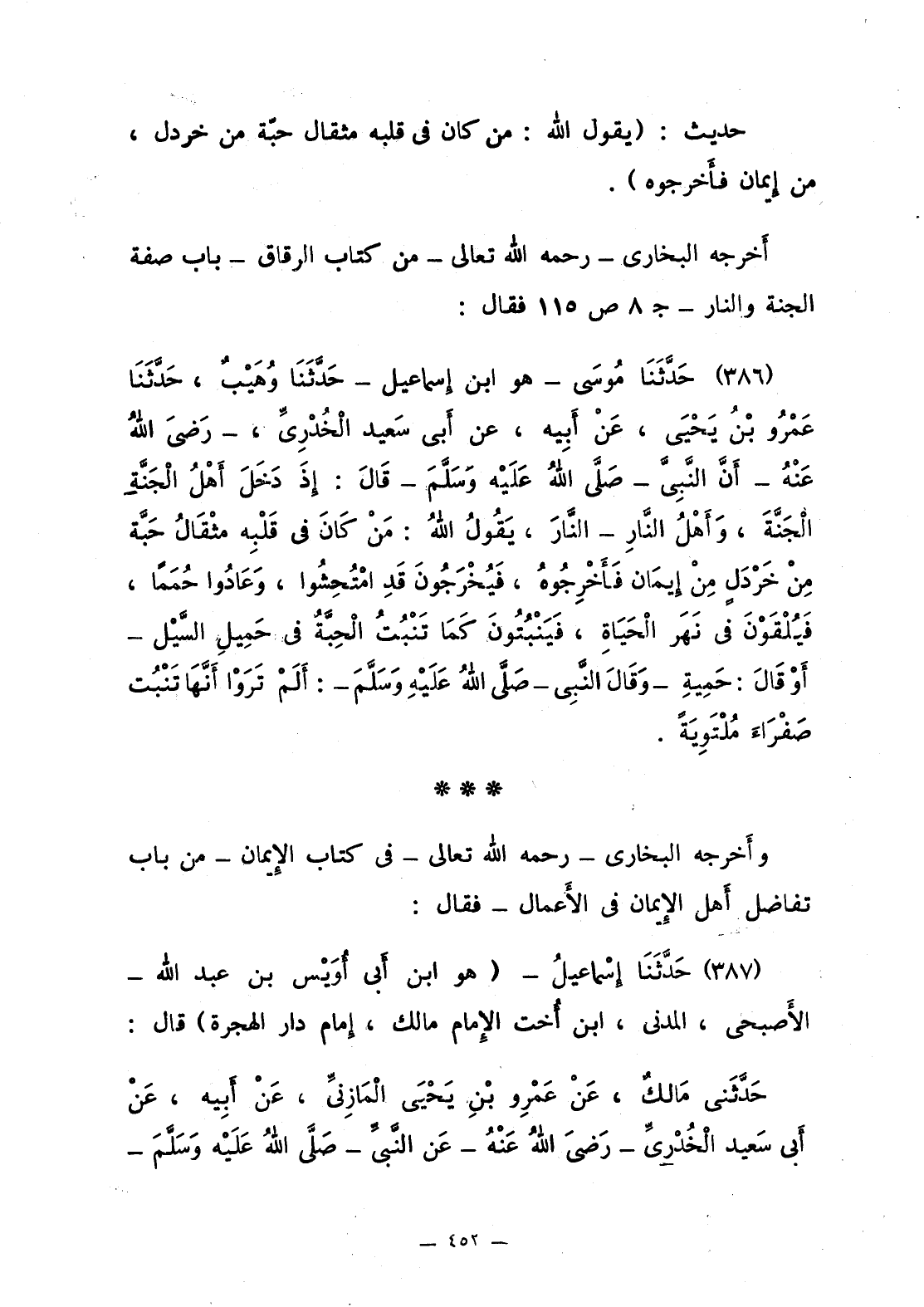 387 - حَدَّثَنَا مُوسَى - هو ابن إسماعيل - حَدَّثَنَا وُهَيْبٌ، حَدَّثَنَا عَمْرُو بْنُ يَحْيَى، عَنْ أَبِيه، عن أبي سعيد الْخُدْرِيِّ، - رَضِيَ اللَّهُ عَنْهُ - أَنَّ النَّبِيِّ صلى الله عليه وسلم قَالَ: «إذْ دَخَلَ أَهْلُ الْجَنَّةِ الْجَنَّةَ، وَأَهْلُ النَّارِ - النَّارَ، يَقُولُ اللهُ: مَنْ كانَ في قَلْبِهِ مثْقَالُ حَبَّةٍ مِنْ خَرْدَلٍ مِنْ إيمَانٍ فَأَخْرجُوهُ، فَيُخْرَجُونَ قَدِ امْتُحِشُوا، وَعَادُوا حُمَما، فَيُلْقَوْنَ في نَهَر الْحَيَاةِ، فَيَنْبُتُونَ كَمَا تَنْبُتُ الْحَبَّةُ في حَمِيلِ السَّيْلِ - أوْ قَالَ: حَمِيةِ - وقَالَ النَّبيُّ: أَلَمْ تَرَوْا أَنَّهَا تَنْبُت صَفْرَاءَ مُلْتَوِيَةً».