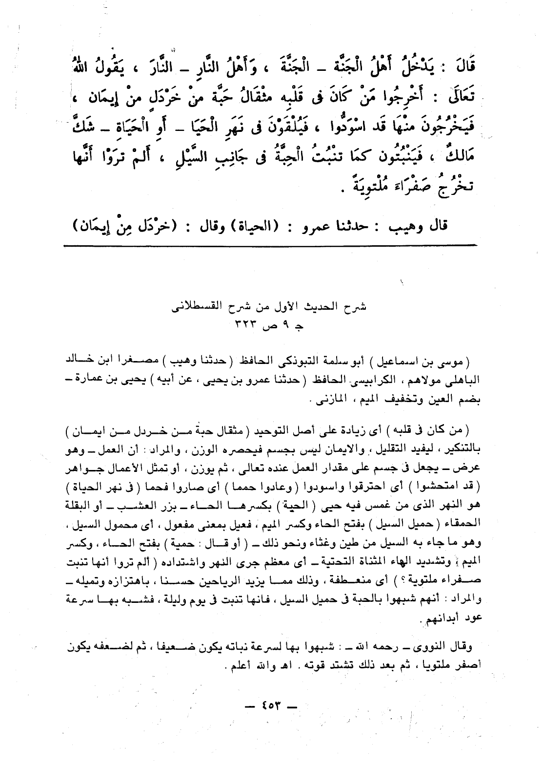 قَالَ: «يَدْخُلُ أَهْلُ الْجَنَّة - الْجَنَّةَ، وَأَهْلُ النَّارِ - النَّارَ، يَقُولُ اللَّهُ تَعَالَى: أَخْرِجُوا مَن كانَ في قَلْبِهِ مِثقالُ حَبَّة منْ خَرْدَلٍ منْ إيمَان، فَيَخْرُجُونَ منْهَا قَد اسْوَدُّوا، فَيُلْقَوْنَ في نَهَرِ الْحَيَا - أَوِ الْحَيَاةِ - شَكَّ مَالكٌ، فَيَنْبُتُون كما تنْبُتُ الْحَبَّةُ في جَانِبِ السَّيْلِ، أَلمْ ترَوْا أَنَّها تخْرُجُ صَفْرَاءَ مُلْتَوِيَةً».