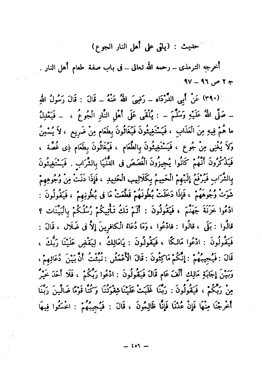 391 - عَنْ أَبِي الدَّرْدَاءِ - رَضِيَ اللَّهُ عَنْهُ - قَالَ: قَالَ رَسُولُ اللَّهِ صلى الله عليه وسلّم: «يُلْقَى عَلَى أَهْلِ النَّارِ الجُوعُ، - فَيَعْدِلُ ما هُمْ فِيهِ مِنَ الْعَذَابِ، فَيَسْتَغِيثُونَ فَيُغَاثُونَ بِطَعامٍ مِنْ ضَرِيع، لاَ يُسْمِنُ وَلاَ يُغْنِي مِنْ جُوع، فَيَسْتَغَيثُونَ بِالطَّعَامِ، فَيُغَاثُونَ بِطَعَام ذِي غُصَّة، فَيَذْكُرُونَ أَنَّهُمْ كَانُوا يُجِيزُونَ الْغُصَصَ في الدُّنْيَا بالشَّرَابِ. فَيَسْتَغِيثُونَ بِالشَّرَابِ فَيُرْفَعُ إلَيْهِمْ الْحَمِيمُ بِكَلاَلِيب الْحَديدِ، فَإذَا دَنَتْ مِنْ وُجُوهِهِمْ شَوَتَ وُجُوهَهُمْ، فَإذَا دَخَلَتْ بُطُونَهُمْ قَطَّعَتْ مَا في بُطُونِهِمْ، فَيَقُولُونَ: ادْعُوا خَزَنَةَ جَهَنَّمَ، فَيَقُولُونَ: أَلَمْ تَكُ تَأْتِيكُمْ رُسُلُكُمْ بِالْبَيِّنَات؟ قالُوا: بَلَى، قالُوا: فادْعُوا، وَمَا دَعَاءُ الْكافرِينَ إلاَّ في ضَلاَل، قَالَ: فَيَقُولُونَ: ادْعُوا مَالكا، فَيَقُولُونَ: يَا مَالِكُ، لِيَقْضِ علَيْنَا رَبُّكَ، قَالَ: فَيُجِيبُهُمْ: إنَّكُمْ مَاكِثُونَ». قالَ الأَعْمَشُ: نُبِّئْتُ أَنَّ بَيْنَ دُعَائِهِمْ، وَبَيْنَ إجَابَةِ مَالِكٍ أَلْفَ عَام قالَ «فَيَقُولُونَ: ادْعُوا رَبَّكُمْ، فَلاَ أَحَدَ خَيْرٌ مِنْ رَبِّكُمْ، فَيَقُولُونَ: رَبَّنَا غَلَبَتْ عَلَيْنَا شِقْوَتُنَا وَكُنَّا قَوْما ضَالِّينَ رَبَّنَا أَخْرِجْنَا مِنْهَا فَإنْ عُدْنَا فَإنَّا ظَالِمُونَ، قَالَ: فَيُجِيبُهُمْ: اخْسَئُوا فِيهَا