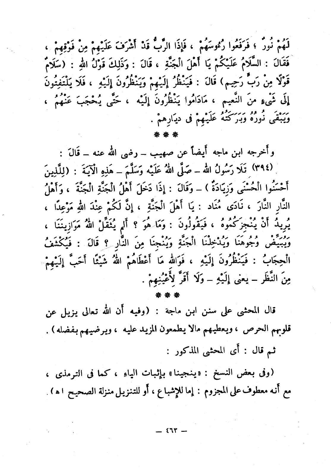 395 - تَلاَ رَسُولُ اللَّهِ صلى الله عليه وسلّم هَذِهِ الآيَةِ: {لِّلَّذِينَ أَحْسَنُواْ الْحُسْنَى وَزِيَادَةٌ} - وَقَالَ: إذَا دَخَلَ أَهُلْ الْجَنَّةِ الْجَنَّةَ، وَأَهْلُ النَّارِ النَّارَ، نَادَى مُنَاد: يا أَهْلَ الْجَنَّةِ، إنَّ لَكُمْ عِنْدَ اللَّهِ مَوْعِدا، يُرِيدُ أَنْ يُنْجِزَكُمُوهُ، فَيَقُولُونَ: وَمَا هُوَ؟ أَلَمْ يُثَقِّلْ اللَّهُ مَوَازِينَنَا، وَيُبَيِّضْ وُجُوهَنَا وَيُدْخِلْنَا الْجَنَّةَ وَيُنْجِنَا مِنَ النَّارِ؟ قَالَ: فَيُكْشَفُ الْحِجَابُ: فَيَنْظُرُونَ إلَيْهِ، فَوَاللَّهِ مَا أَعْطَاهُم اللَّهُ شَيْئا أَحَبَّ إلَيْهِمْ مِنَ النَّظَرِ - يعني إلَيْهِ - وَلاَ أَقَرَّ لأَعْيُنِهِمْ.