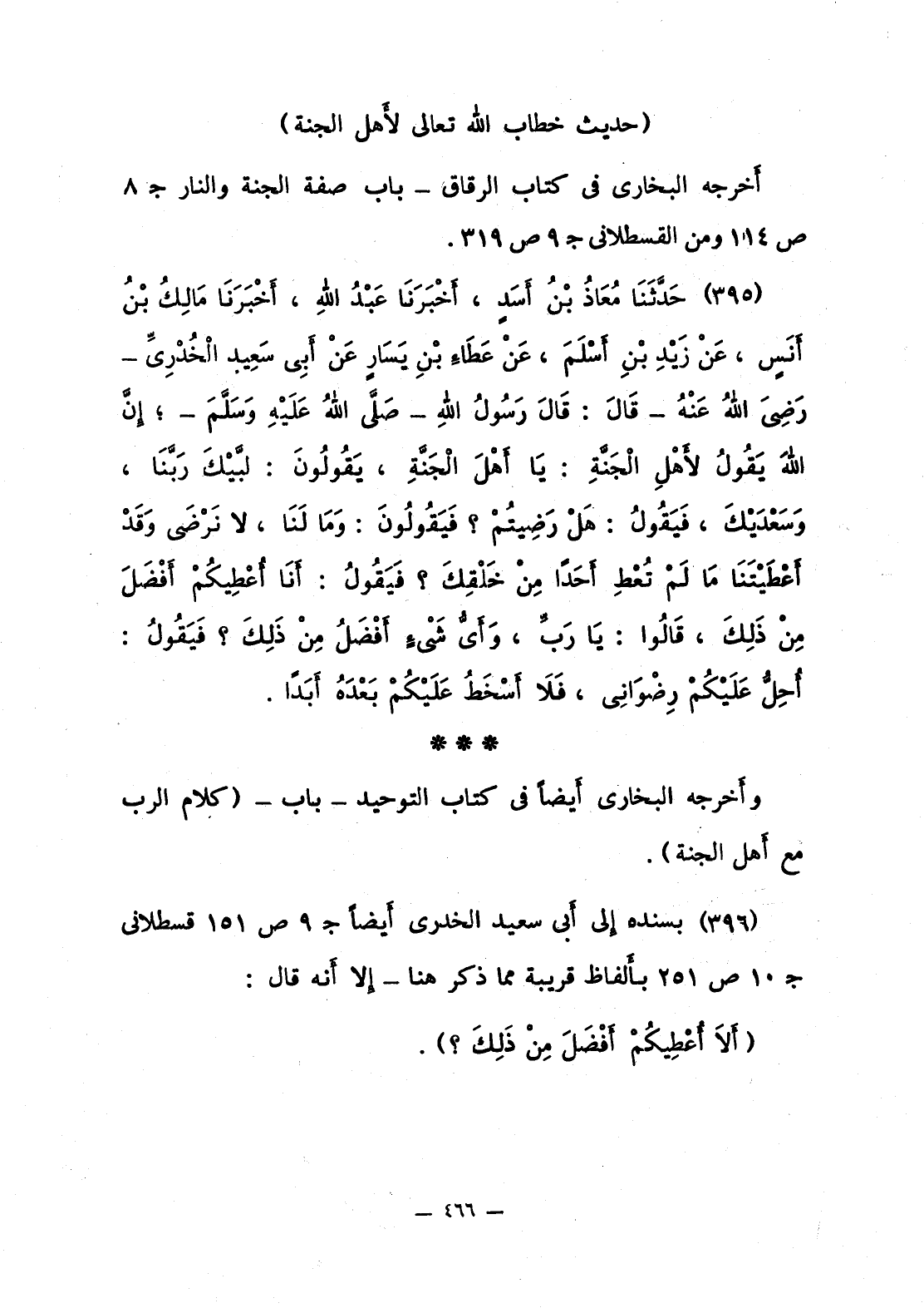 396 - حَدَّثَنَا مُعَاذُ بْنُ أَسَدٍ، أَخْبَرَنَا عَبْدُ اللَّهِ، أَخْبَرَنَا مَالِكُ بْنُ أَنَسٍ، عَنْ زَيْدِ بْنِ أَسْلَمَ، عَنْ عَطَاءِ بْنِ يَسَارٍ عَنْ أَبِي سَعِيد الْخُدْرِيِّ - رَضِيَ اللَّهُ عَنْهُ - قَالَ: قالَ رَسُولُ اللَّهِ صلى الله عليه وسلّم: «إنَّ اللَّهَ يَقُولُ لأَهْلِ الْجَنَّةِ: يَا أَهْلَ الْجَنةِ، يَقُولُونَ: لَبَّيْكَ رَبَّنَا، وَسَعْدَيْكَ، فَيَقُولُ: هَلْ رَضِيتُمْ؟ فَيَقُولُونَ: وَمَا لَنَا، لا نَرْضَى وَقَدْ أَعْطَيْتَنَا مَا لَمْ تُعْطِ أَحَدا مِنْ خَلْقِكَ؟ فَيَقُولُ: أَنَا أُعْطِيكُمْ أَفْضَلَ مِنْ ذَلِكَ، قَالُوا: يَا رَبِّ، وَأَيُّ شَيْءٍ أَفْضَلُ مِنْ ذَلِكَ؟ فَيَقُولُ: أُحِلُّ عَلَيْكُمْ رِضْوَانِي، فَلاَ أَسْخَطُ عَلَيْكُمْ بَعْدَهُ أَبدا».
