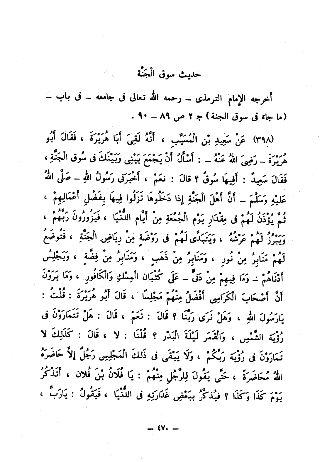 399 - عَنْ سَعِيدِ بْنِ الْمُسَيَّبِ، أَنَّهُ لَقِيَ أَبَا هُرَيْرَةَ، فَقالَ أَبُو هُرَيْرَةَ - رَضِيَ اللَّهُ عَنْهُ - أَسْأَلُ أَنْ يَجْمَعَ بَيْنِي وَبَيْنَكَ في سُوق الْجَنَّةِ، فَقَالَ سَعِيدٌ: أَفِيهَا سُوقٌ؟ قَالَ: نعَمْ، أَخْبَرَني رَسُولُ اللَّهِ صلى الله عليه وسلّم «أَنَّ أَهْلَ الْجَنَّةِ إذا دَخَلُوهَا نَزَلُوا فِيهَا بِفَضْلِ أَعْمَالِهِمْ، ثُمَّ يُوْذَنُ لَهُمْ في مِقْدَارِ يَوْمِ الْجُمُعَةِ مِنْ أَيَّامِ الدُّنْيَا، فَيَزُورُونَ رَبَّهُمْ، وَيَبْرُزُ لَهُمْ عَرْشُهُ، وَيَتَبَدَّى لَهُمْ في رَوْضَةٍ مِنْ رِيَاضِ الْجَنَّةِ، فَتُوضَعُ لَهُمْ مَنَابِرُ مِنْ نُورٍ، وَمَنَابِرُ مِنْ ذَهَبٍ، وَمَنَابِرُ مِنْ فِضَّةٍ، وَيَجْلِسُ أَدْنَاهُمْ - وَمَا فِيهِمْ مِنْ دَنيٍّ - عَلَى كُثْبَان الْمِسْكِ وَالْكَافُورِ، وَمَا يَرَوْنَ أَنَّ أَصْحَابَ الْكَرَاسِي أَفْضَلُ مِنْهُمْ مَجْلِسا»، قَالَ أَبُو هُرَيْرَةَ: قُلْتُ: يَا رَسُولَ اللَّهِ، وَهَلْ نَرَى رَبَّنَا؟ قَالَ: «نَعَمْ، قَالَ: هَلْ تَتَمَارَوْنَ في رُوْيَةِ الشَّمْسِ، وَالْقَمَرَ لَيْلَةَ الْبَدْر؟» قُلْنَا: لا، قَالَ: «كَذَلكَ لا تَمَارَوْنَ في رُوْيَة رَبِّكُمْ، وَلاَ يَبْقَى في ذَلِكَ الْمَجْلِسِ رَجُلٌ إلاَّ حَاضَرَهُ اللَّهُ مُحَاضَرَةً، حَتَّى يَقُولَ لِلرَّجُلِ مِنْهُمْ: يَا فُلاَنُ بْنَ فُلان، أَتَذْكُرُ يَوْمَ كَذَا وَكَذَا؟ فيُذكَّرُ بِبَعْضِ غَدَارَتِهِ في الدُّنْيَا، فَيَقُولُ: يَا رَبِّ،