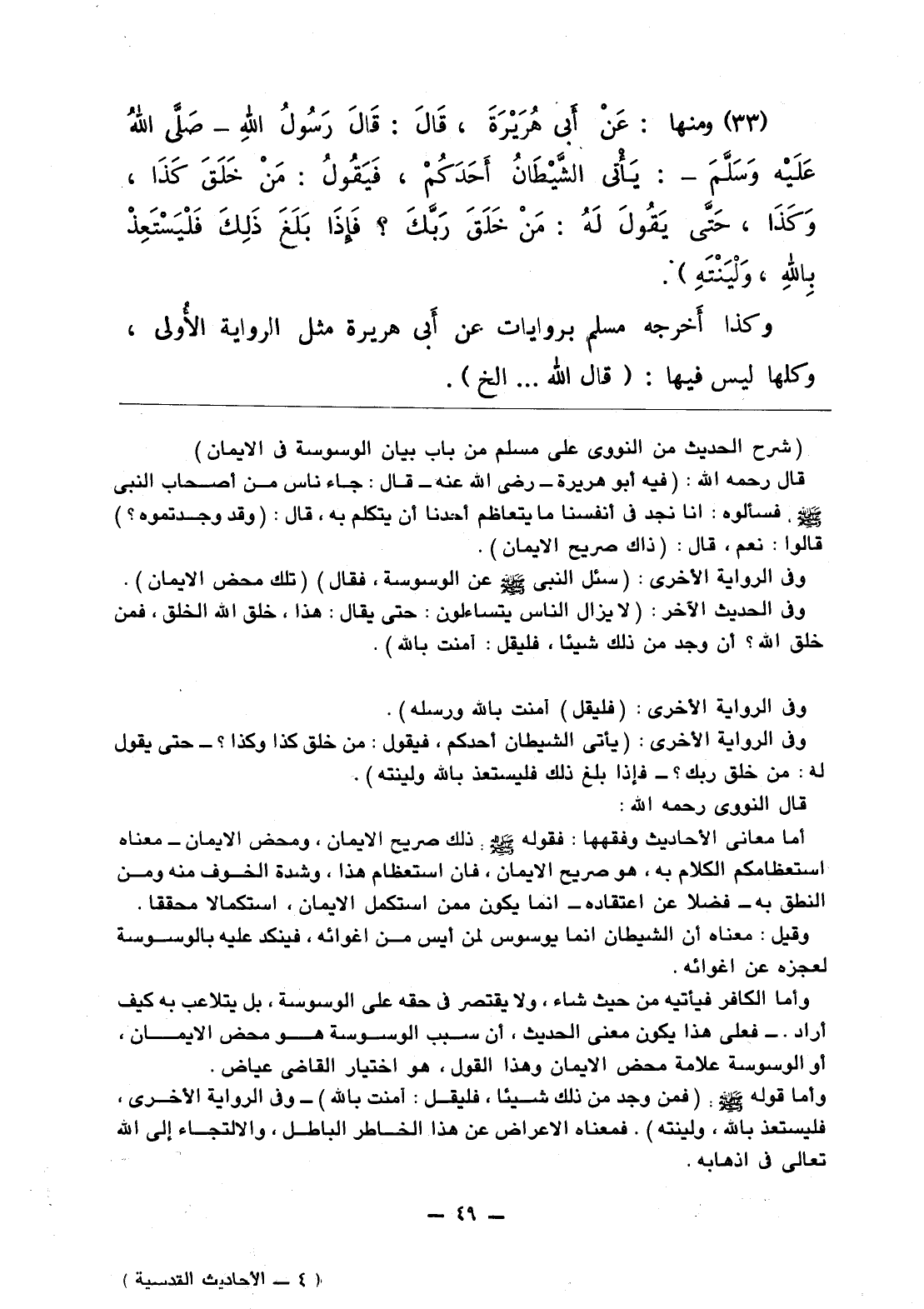 33 - ومنها: عَنْ أَبي هُرَيْرَةَ، قَالَ: قَالَ رَسُولُ اللَّهِ صلى الله عليه وسلّم: «يَأْتِي الشَّيْطَانُ أَحَدَكُمْ، فَيَقُولُ: مَنْ خَلَقَ كَذَا، وَكَذَا، حَتَّى يَقُولَ لَهُ: مَنْ خَلَقَ رَبَّكَ؟ فَإذَا بَلَغَ ذَلِكَ فَلْيَسْتَعِذْ بِاللَّهِ، وَلْيَنْتَهِ».