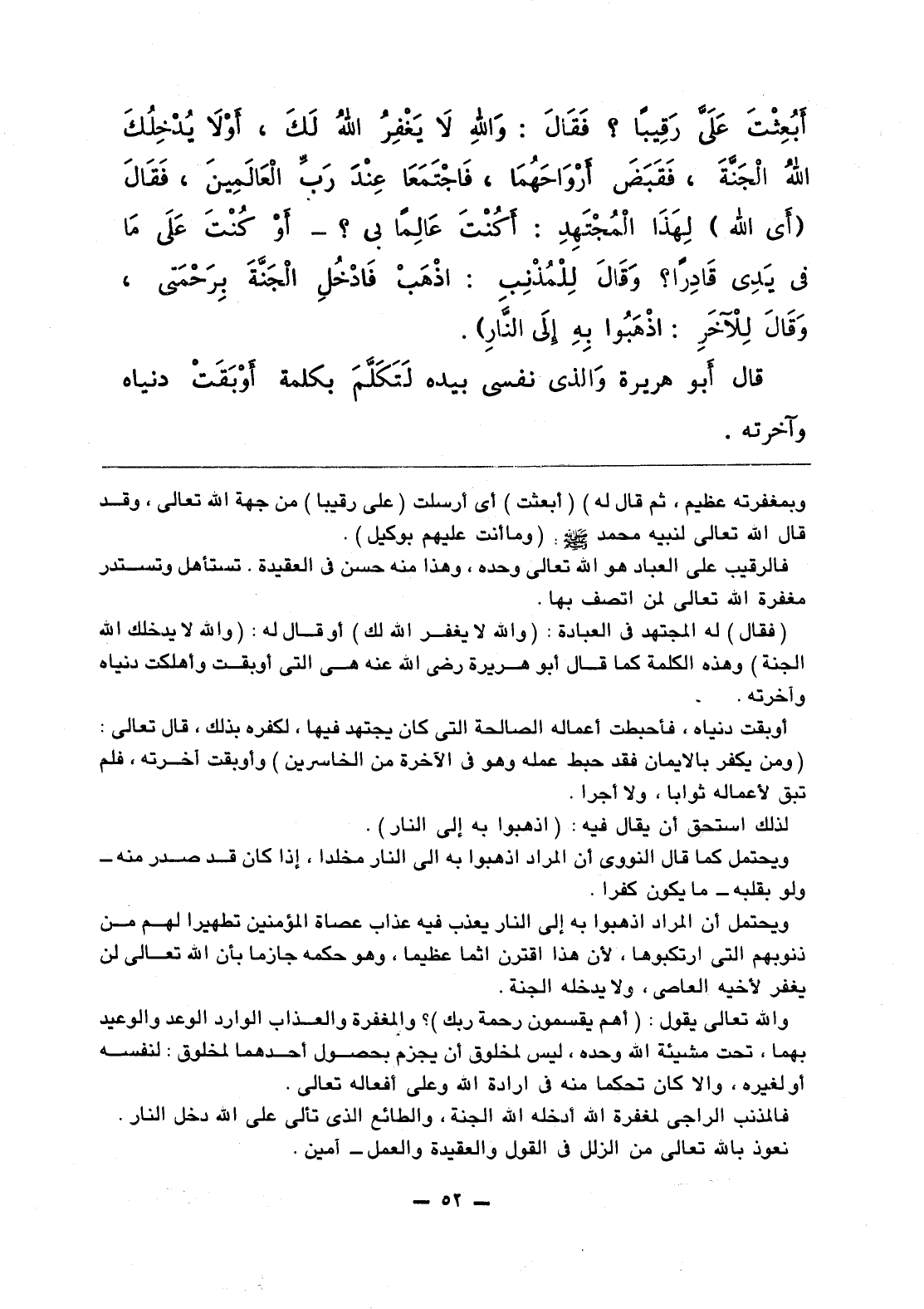 أَبُعِثْتَ عَلَيَّ رَقِيبا؟ فقَالَ: وَاللَّهِ لاَ يَغْفِرُ اللَّهُ لَكَ، أَوْ لاَ يُدْخِلُكَ اللَّهُ الْجَنَّةَ، فَقَبَضَ أَرْوَاحَهُما، فَاجْتَمَعَا عِنْدَ رَبِّ الْعَالَمِينَ، فَقَالَ (أَي الله) لِهَذَا الْمُجْتَهِدِ: أَكُنْتَ عَالِما بي؟ - أَوْ كُنْتَ عَلَى مَا في يَدِي قَادِرا؟ وَقَالَ لِلْمُذْنِبِ: اذْهَبْ فَادْخُلِ الْجَنَّةَ بِرَحْمَتي، وَقَالَ للآخَرِ: اذْهَبُوا بِهِ إلَى النَّارِ».