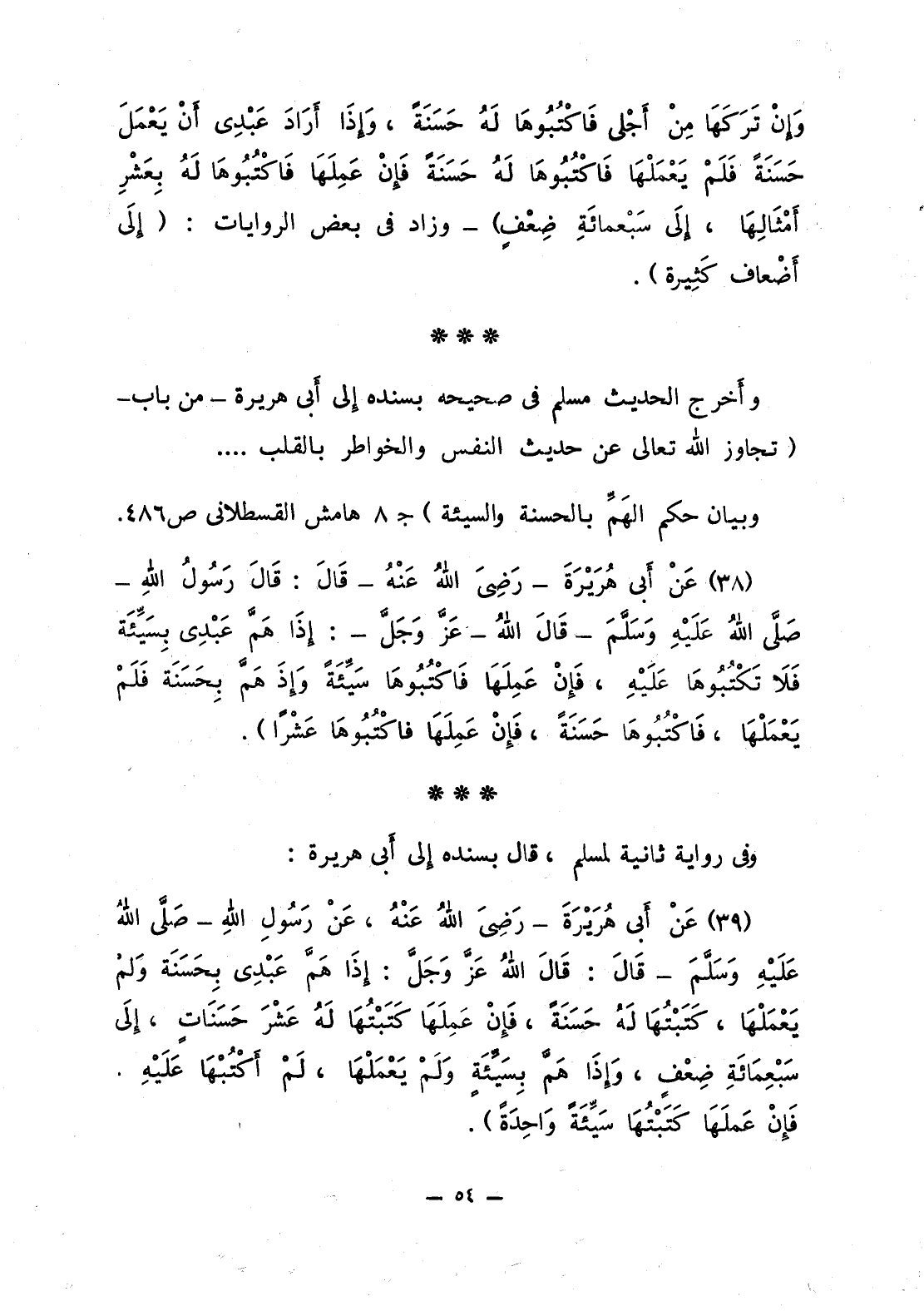 38 - عَنْ أَبي هُرَيْرَةَ - رَضِيَ اللَّهُ عَنْهُ - قَالَ: قالَ رَسُولُ اللَّهِ صلى الله عليه وسلّم: «قَالَ اللَّهُ - عَزَّ وَجَلَّ: إذَا هَمَّ عَبْدِي بِسَيِّئَةٍ فَلاَ تَكْتُبُوهَا عَلَيْهِ، فَإنْ عَمِلَهَا فَاكْتُبُوهَا سَيِّئَةً وَإذَا هَمَّ بِحَسَنَةٍ فَلَمْ يَعْمَلَهَا، فَاكْتُبُوهَا حَسَنَةً، فَإنْ عَمِلَهَا فَاكْتُبُوهَا عَشْرا».