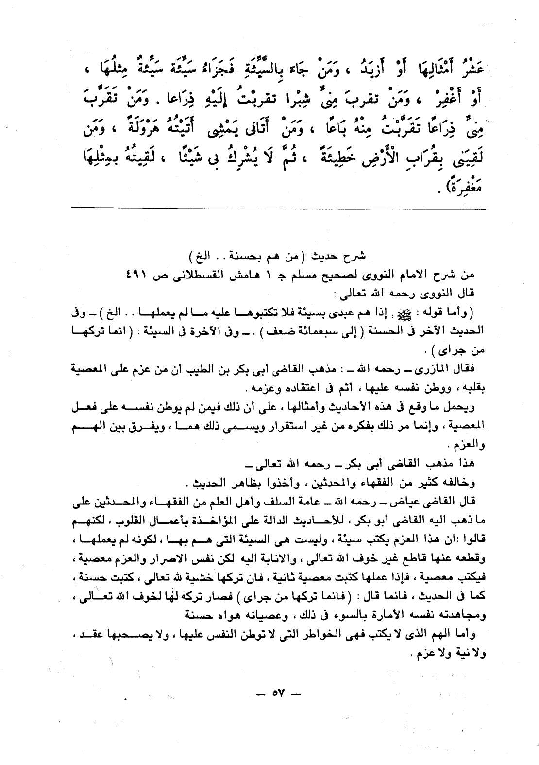 عَشْرُ أَمْثَالِهَا أَوْ أَزْيَدُ، وَمَنْ جَاءَ بِالسَّيِّئَةِ فَجَزَاءُ سَيِّئَةٍ سَيِّئَةٍ مِثْلُهَا، أَوْ أَغْفِرْ، وَمَنْ تقرَّبَ مِنِّي شِبْرا تَقَرَّبْتُ إلَيْهِ ذِرَاعا. وَمَنْ تَقَرَّبَ مِنِّي ذِرَاعا تَقَرَّبْتُ مِنْهُ بَاعا، وَمَنْ أَتَاني يَمْشِي أَتَيْتُهُ هَرْوَلَةً، وَمَنْ لَقِيَنِي بِقُرَابِ الأَرْضِ خَطِيئَةً، ثُمَّ لاَ يُشْرِكُ بي شَيْئا، لَقِيتُهُ بِمِثْلِهَا مَغْفِرَةً».