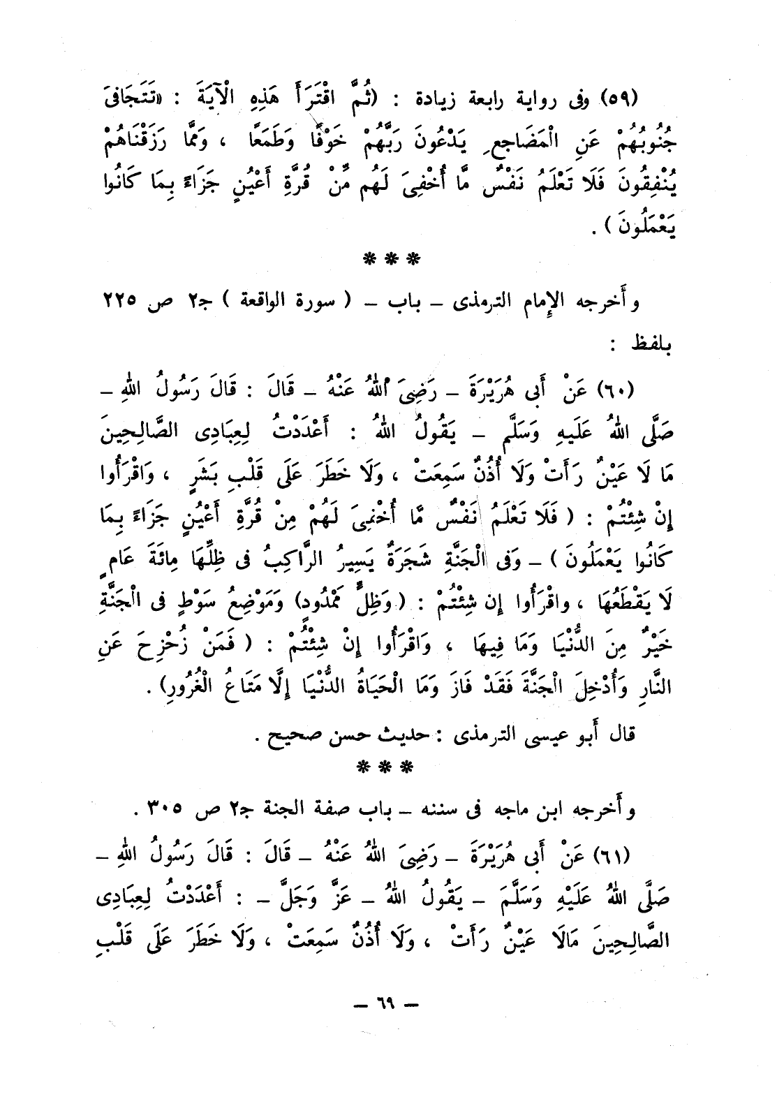 60 - عَنْ أَبي هُرَيْرَةَ - رَضِيَ اللَّهُ عَنْهُ قَالَ: قَالَ رَسُولُ اللَّهِ صلى الله عليه وسلّم: «يَقُولُ اللَّهُ: أَعْدَدْتُ لِعِبَادِي الصَّالِحِينَ مَا لاَ عَيْنٌ رَأَتْ وَلاَ أُذُنٌ سَمِعَتْ، وَلاَ خَطَرَ عَلَى قَلْبِ بَشَرٍ، وَاقْرَأُوا إنْ شِئْتُمْ: {فَلاَ تَعْلَمُ نَفْسٌ مَّآ أُخْفِيَ لَهُم مِّن قُرَّةِ أَعْيُنٍ جَزَآءً بِمَا كَانُواْ يَعْمَلُونَ} - وَفي الْجَنَّةِ شَجَرَةٌ يَسِيرُ الرَّاكِبُ في ظِلِّهَا مِائَةَ عَامٍ لاَ يَقْطَعُهَا، وَاقْرَأُوا إن شِئْتُم: {وَظِلٍّ مَّمْدُودٍ} وَمَوْضِعُ سَوْطٍ في الْجَنَّةِ خَيْرٌ مِنَ الدُّنْيَا وَمَا فِيهَا، وَاقْرَأُوا إنْ شِئْتُمْ: {فَمَن زُحْزِحَ عَنِ النَّارِ وَأُدْخِلَ الْجَنَّةَ فَقَدْ فَازَ وَما الْحَيَاةُ الدُّنْيَا إِلاَّ مَتَاعُ الْغُرُورِ}».