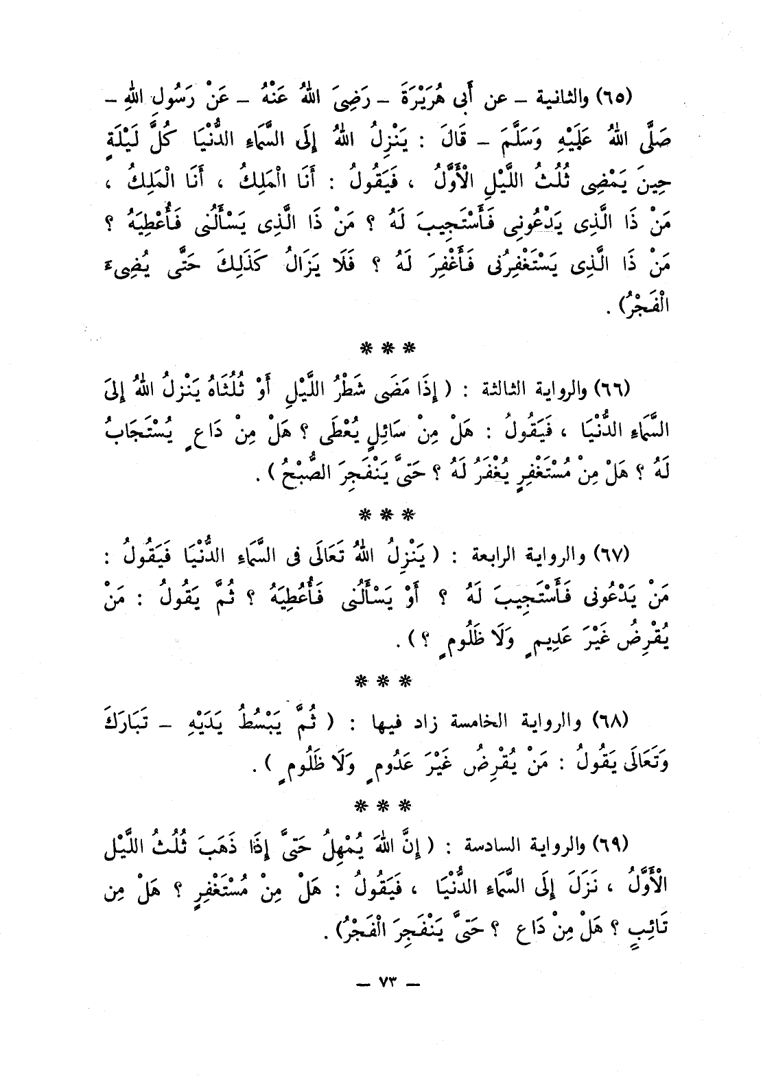 67 - والرواية الرابعة: «يَنْزِلُ اللَّهُ تَعَالَى في السَّمَاءِ الدُّنْيَا فَيَقُولُ: مَنْ يَدْعُونِي فَأَسْتَجِيبَ لَهُ؟ أَوْ يَسْأَلُنِي فَأُعْطِيَهُ؟ ثُمَّ يَقُولُ: مَنْ يُقْرِضُ غَيْرَ عَدِيمٍ وَلاَ ظَلُومٍ؟».