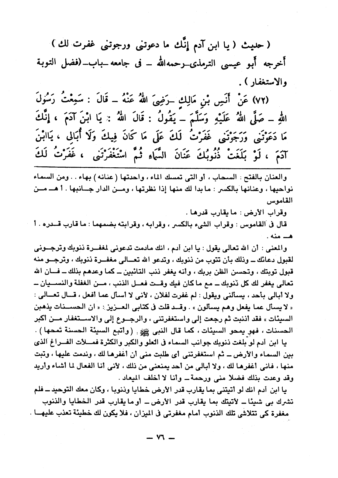 72 - عَنْ أَنَسِ بْنِ مَالِكٍ - رَضِيَ اللَّهُ عَنْهُ - قَالَ: سَمِعْتُ رَسُولَ اللَّهِ يَقُولُ: «قَالَ اللَّهُ: يَا ابْنَ آدَمَ، إنَّكَ مَا دَعَوْتَنِي وَرَجَوْتَنِي غَفَرْتُ لَكَ عَلَى مَا كَانَ فِيكَ وَلاَ أُبَالِي، يَا ابْنَ آدَمَ، لَوْ بَلَغَتْ ذُنُوبُكَ عَنَانَ السَّمَاءِ ثُمَّ اسْتَغْفَرْتَنِي، غَفَرْتُ لَكَ