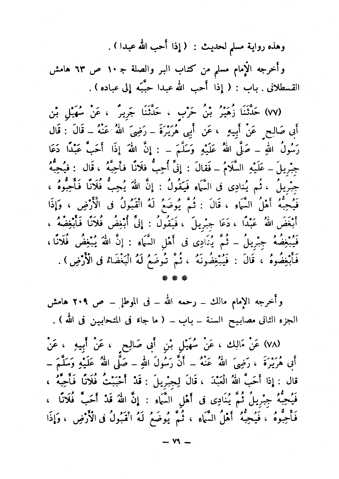 77 - حَدَّثَنَا زُهَيْرُ بْنُ حَرْبٍ، حَدَّثَنَا جَرِيرٌ، عَنْ سُهَيْلِ بْن أَبي صَالِحٍ عَنْ أَبِيهِ، عَن أَبِي هُرَيْرَةَ - رَضِيَ اللَّهُ عَنْهُ - قَالَ: قَال رَسُولُ اللَّهِ صلى الله عليه وسلّم: «إنَّ اللَّهَ إذَا أَحَبَّ عَبْدا دَعَا جِبْرِيلَ - عَلَيْهِ السَّلاَم - فقَالَ: إنِّي أُحِبّ فلانا فأَحِبَّهُ، قَالَ: فيُحِبُّهُ جِبْرِيلُ، ثُم يُنادِي في السَّماءِ فَيَقُولُ: إنَّ اللَّهَ يُحِبُّ فُلاَنا فَأَحِبُّوهُ، فَيُحِبُّهُ أَهْلُ السَّمَاءِ، قَالَ: ثُمَّ يُوضَعُ لَهُ الْقَبُولُ في الأَرْضِ، وَإذَا أَبْغَضَ اللَّهُ عَبْدا، دَعَا جِبْرِيلَ، فَيَقُولُ: إنِّي أُبْغِضُ فُلاَنا فَأَبْغِضْهُ، فَيُبْغِضُهُ جِبْرِيلُ - ثُمَّ يُنَادِي في أَهْلِ السَّمَاءِ: إنَّ اللَّهَ يُبْغِضُ فُلاَنا، فَأَبْغِضُوهُ قَالَ: فَيُبْغِضُونَهُ، ثُمَّ تُوضَعُ لَهُ الْبَغْضَاءُ في الأَرْضِ».