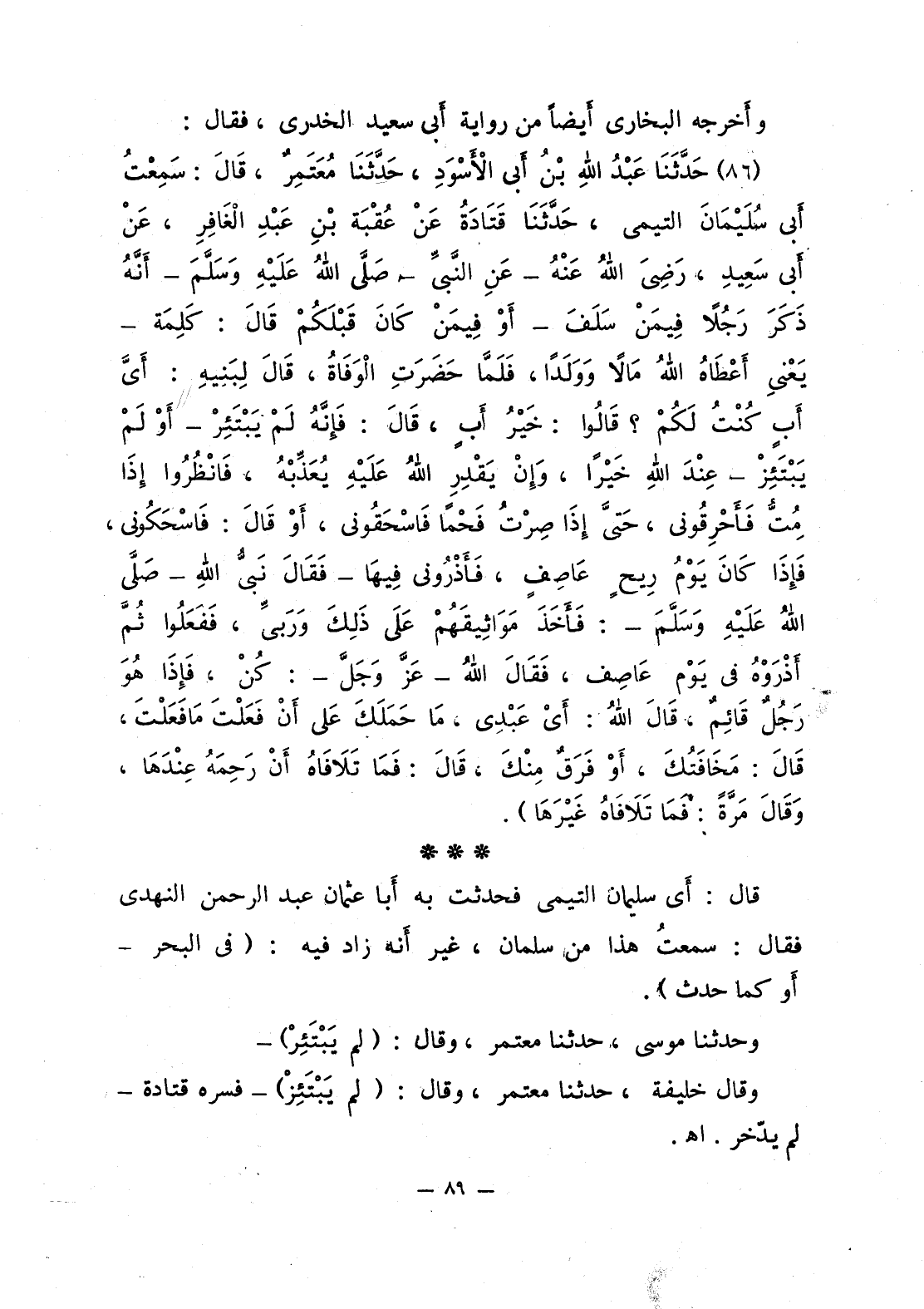 87 - حَدَّثَنَا عَبْدُ اللَّهِ بْنُ أَبي الأَسْوَدِ، حَدَّثَنَا مُعْتَمِرٌ، قَالَ: سَمِعْتُ أَبي سُلَيْمَانُ التيمي، حَدَّثَنَا قَتَادَةُ عَنْ عُقْبَةَ بْنِ عَبْدِ الْغَافِرِ، عَنْ أَبي سَعيدٍ، رَضِيَ اللَّهُ عَنْهُ - عَنِ النَّبيِّ أَنَّهُ ذَكَر رَجُلاً فِيمَنْ سَلَفَ - أَوْ فِيمَنْ كَانَ قَبْلَكُمْ قَالَ: كَلِمَة - يَعْنِي أَعْطَاهُ اللَّهُ مَالاً وَوَلَدا، «فَلَمَّا حَضَرَتِ الْوَفَاةُ، قَالَ لِبَنِيهِ: أَيَّ أَبٍ كُنْتُ لَكُمْ؟ قَالُوا: خَيْرُ أَبٍ، قَالَ: فَإنَّهُ لَمْ يَبْتَئِرْ - أَوْ لَمْ يَبْتَئِزْ - عِنْدَ اللَّهِ خَيْرا، وَإنْ يَقْدِرِ اللَّهُ عَلَيْهِ يُعَذِّبْهُ، فَانْظُرُوا إذَا مُتُّ فَأَحْرِقُوني، حَتَّى إذَا صِرْتُ فَحْما فَاسْحَقُوني، أَوْ قَالَ: فَاسْحَكُوني، فَإذَا كَانَ يَوْمَ رِيحٍ عَاصِفٍ، فَأَذْرُوني فِيهَا - فَقَالَ نَبيُّ اللَّهِ: فَأَخَذَ مَوَاثِيقَهُمْ عَلَى ذَلِكَ وَرَبِّي، فَفَعَلُوا ثُمَّ أَذْرَوْهُ في يَوْمٍ عَاصِف، فَقَالَ اللَّهُ - عَزَّ وَجَلَّ -: كُنْ، فَإذَا هُوَ رَجُلٌ قَائِمٌ، قَالَ اللَّهُ: أَيْ عَبْدِي، مَا حَمَلَكَ عَلى أَنْ فَعَلْتَ مَا فَعَلْتَ، قَالَ: مَخَافَتُكَ، أَوْ فَرَقٌ مِنْكَ، قَالَ: فَمَا تَلاَفَاهُ أَنْ رَحِمَهُ عِنْدَهَا، وَقَالَ مَرَّةً: فَمَا تَلاَفَاهُ غَيْرَهَا».