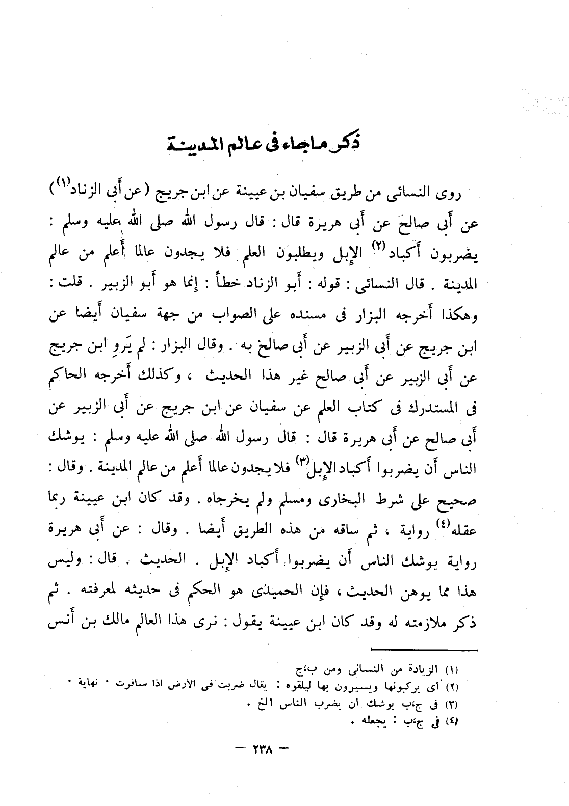 روى النسائي من طريق سفيان بن عيينة عن ابن جريج (عن أبي الزناد) عن أبي صالح عن أبي هريرة قال: قال رسول الله صلى الله عليه وسلم: يضربون أكباد الإبل ويطلبون العلم. فلا يجدون عالما أعلم من عالم المدينة. قال النسائي: قوله: أبو الزناد خطأ: إنما هو الزبير. قلت: وهكذا أخرجه البزار في مسنده على الصواب من جهة سفيان أيضا عن ابن جريج عن أبي الزبير عن أبي صالح به. وقال البزار: لم يَروِ ابن جريج عن أبي الزبير عن أبي صالح غير هذا الحديث، وكذلك أخرجه الحاكم في المستدرك في كتاب العلم عن سفيان عن ابن جريج عن أبي الزبير عن أبي صالح عن أبي هريرة قال: قال رسول الله صلى الله عليه وسلم: يوشك الناس أن يضربوا أكباد الإبل فلا يجدون عالما أعلم من عالم المدينة. وقال: صحيح على شرط البخاري ومسلم ولم يخرجاه. وقد كان ابن عيينة ربما عقله رواية، ثم ساقه من هذه الطريق أيضا. وقال: عن أبي هريرة رواية يوشك الناس أن يضربوا أكباد الإبل. الحديث. قال: وليس هذا مما يوهن الحديث، فإن الحميدي هو الحكم في حديثه لمعرفته. ثم ذكر ملازمته له وقد كان ابن عيينة يقول: نرى هذا العالم مالك بن أنس