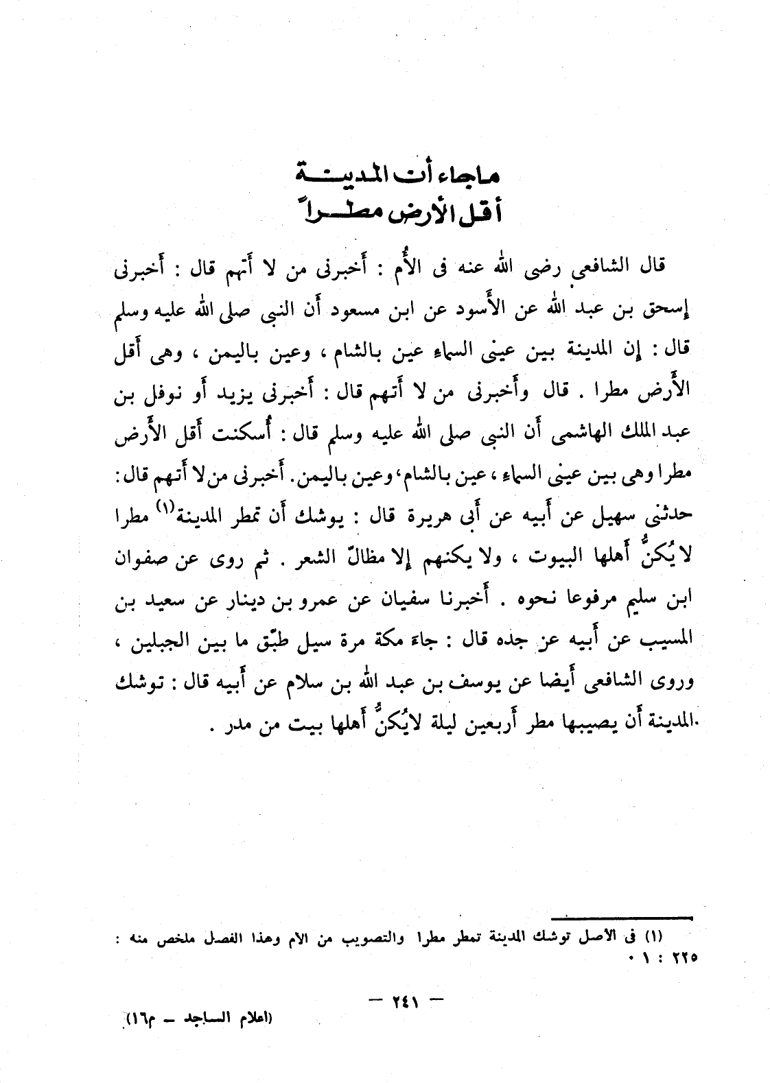 قال الشافعي رضي الله عنه في الأُم: أخبرني نت لا أتهم قال: أخبرني إسحق بن عبد الله عن الأسود عن ابن مسعود أن النبي صلى الله عليه وسلم قال: إن المدينة بين عيني السماءِ عين بالشام، وعين باليمن، وهي أقل الأرض مطرا. قال وأَخبرني من لا أتهم قال: أخبرني يزيد أو نوفل بن عبد الملك الهاشمي أَن النبي صلى الله عليه وسلم قال: أُسكنت أَقل الأَرض مطرا وهي بين عيني السماءِ، عين بالشام، وعين باليمن. أخبرني من لا أتهم قال: حدثني سهيل عن أبيه عن أبي هريرة قال: يوشك أن تمطر المدينة مطرا لا يُكنُّ أَهلها البيوت، ولا يكنهم إلا مظالّ الشعر. ثم روى عن صفوان ابن سليم مرفوعا نحوه. أَخبرنا سفيان بن عمرو بن دينار عن سعيد بن المسيب عن أبيه عن جده قال: جاءَ مكة مرة سيل طبّق ما بين الجبلين، وروى الشافعي أَيضا عن يوسف بن عبد الله بن سلام عن أبيه قال: توشك المدينة أن يصيبها مطر أربعين ليلة لا يُكنُّ أَهلها بيت من مدر.