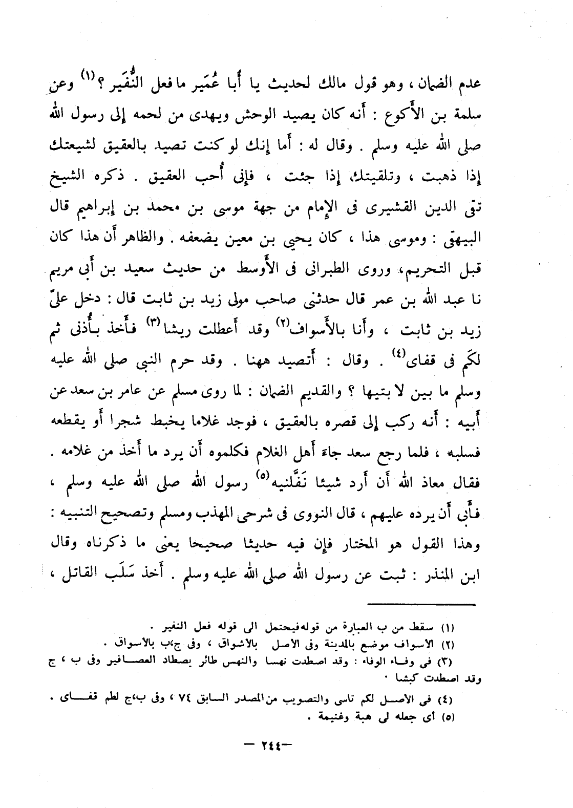 عدم الضمان، وهو قول مالك لحديث يا أبا عمير ما فعل النفير؟ وعن سلمة بن الأكوع: أنه كان يصيد الوحش ويهدى من لحمه إلى رسول الله صلى الله عليه وسلم. وقال له: أَما إِنك لو كنت تصيد بالعقيق لشيعتك إِذا ذهبت، وتلقيتك إذا جئت، فإني أُحب العقيق. ذكره الشيخ تقي الدين القشيري في الإمام من جهة موسى بن محمد بن إبراهيم قال البيهقي: وموسى هذا، كان يحيى بن معين يضعفه. والظاهر أن هذا كان قبل التحريم، وروى الطبراني في الأَوسط من حديث سعيد بن أبي مريم نا عبد الله بن عمر قال حدثني صاحب مولى زيد بن ثابت قال: دخل عليّ زيد بن ثابت، وأنا بالأسواف وقد أعطلت ريشا فأخذ بأُذني ثم لكَمَ في قفاي. وقال: أتصيد ههنا. وقد حرم النبي صلى الله عليه وسلم ما بين لابتيها؟ والقديم الضمان: لما روى مسلم عن عامر بن سعد عن أبيه: أنه ركب إلى قصره بالعقيق، فوجد غلاما يخبط شجرا أو يقطعه فسلبه، فلما رجع سعد جاءَ أهل الغلام فكلموه أن يرد ما أَخذ من غلامه. فقال معاذ الله أن أَرد شيئا نَفَّلنيه رسول الله صلى الله عليه وسلم، فأبى أن يرده عليهم، قال النووي في شرحي المهذب ومسلم وتصحيح التنبيه: وهذا القول هو المختار فإن فيه حديثا صحيحا يعني ما ذكرناه وقال ابن المنذر: ثبت عن رسول الله صلى الله عليه وسلم. أخذ سَلَب القاتل،