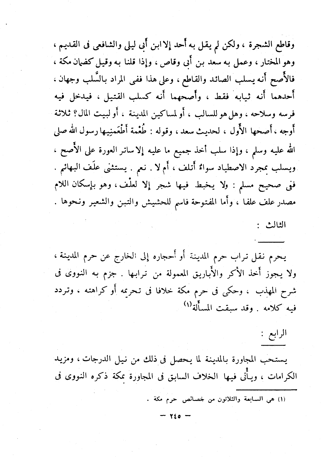 وقاطع الشجرة، ولكن لم يقل به أحد إلا ابن أبي ليلى والشافعي في القديم، وهو المختار، وعمل به سعد بن أبي وقاص، وإذا قلنا به وقيل كضمان مكة، فالأصح أنه يسلب الصائد والقاطع، وعلى هذا ففي المراد بالسَّلب وجهان، أَحدهما أَنه ثيابه فقط، وأصحهما أنه كسلب القتيل، فيدخل فيه فرسه وسلاحه، وهل هو للسالب، أو لمساكين المدينة، أو لبيت المال؟ ثلاثة أوجه، أصحها الأَول، لحديث سعد، وقوله: طُعمة أطعمنيها رسول الله صلى الله عليه وسلم، وإذا سلب أخذ جميع ما عليه إلا ساتر العورة على الأصح، ويسلب بمجرد الاصطياد سواءٌ أَتلف، أم لا. نعم. يستثنى علف البهائم. ففي صحيح مسلم: ولا يخبط فيها شجر إلا لعلْف، وهو بإسكان اللام مصدر علف علفا، وأَما المفتوحة فاسم للحشيش والتبن والشعير ونحوها.