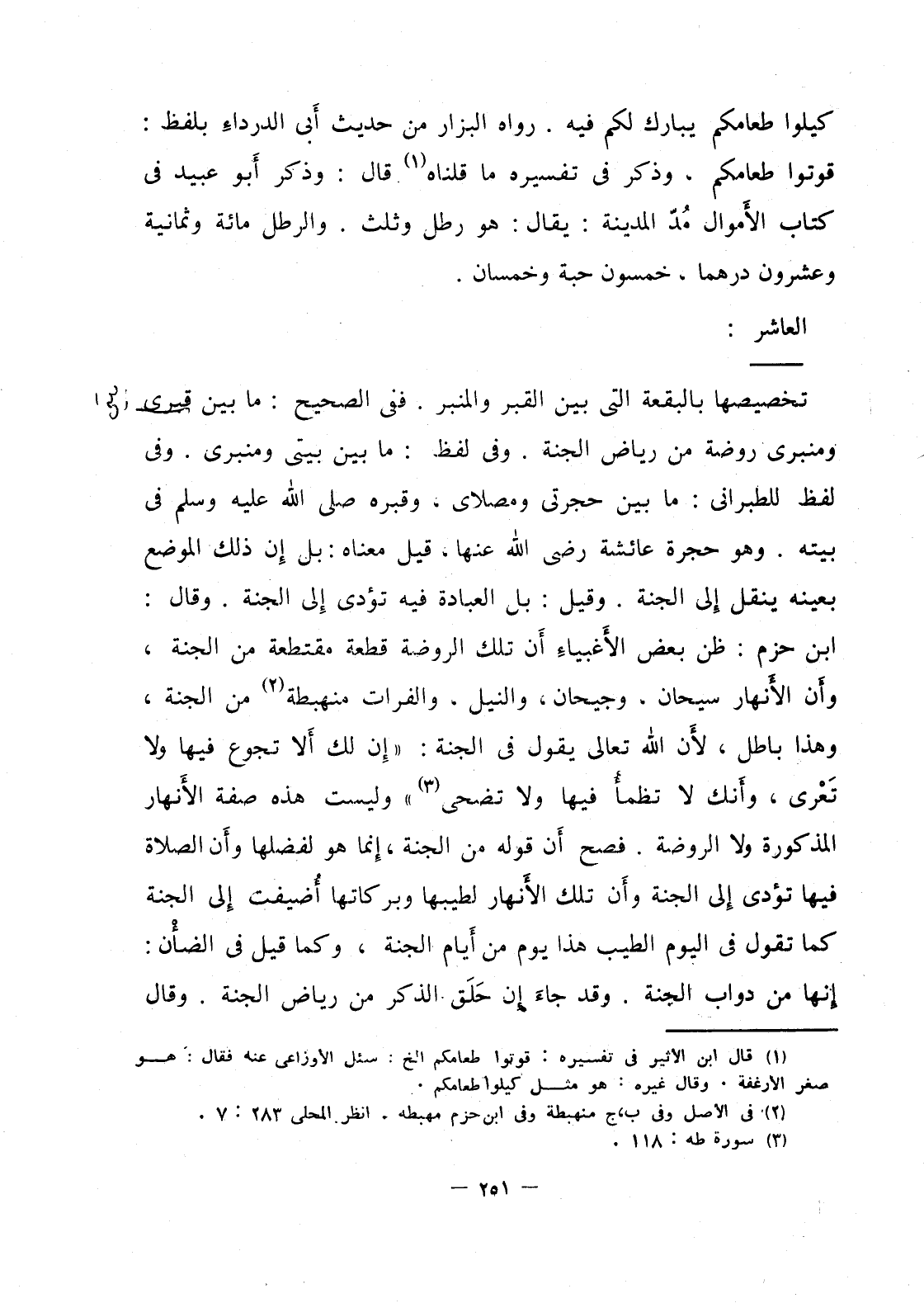 تخصيصها بالبقعة التي بين القبر والمنبر. ففي الصحيح: ما بين قبري ومنبري روضة من رياض الجنة. وفي لفظ: ما بين بيتي ومنبري. وفي لفظ للطبراني: ما بين حجرتي ومصلاي، وقبره صلى الله عليه وسلم في بيته. وهو حجرة عائشة رضي الله عنها، قيل معناه: بل إن ذلك الموضع بعينه ينقل إلى الجنة. وقيل: بل العبادة فيه تؤدي إلى الجنة. وقال: ابن حزم: ظن بعض الأغبياء أن تلك الروضة قطعة مقتطعة من الجنة، وأن الأنهار سيحان، وجيحان، والنيل، والفرات منهبطة من الجنة، وهذا باطل، لأن الله تعالى يقول في الجنة: ((إن لك ألا تجوع فيها ولا تعرى، وأنك لا تظمأُ فيها ولا تضحى)) وليست هذه صفة الأنهار المذكورة ولا الروضة. فصح أَن قوله من الجنة، إنما هو لفضلها وأَن الصلاة فيها تؤدي إلى الجنة وأَن تلك الأنهار لطيبها وبركاتها أُضيفت إلى الجنة كما تقول في اليوم الطيب هذا يوم من أيام الجنة، وكما قيل في الضأن: إنها من دواب الجنة. وقد جاءَ أن حلق الذكر من رياض الجنة. وقال