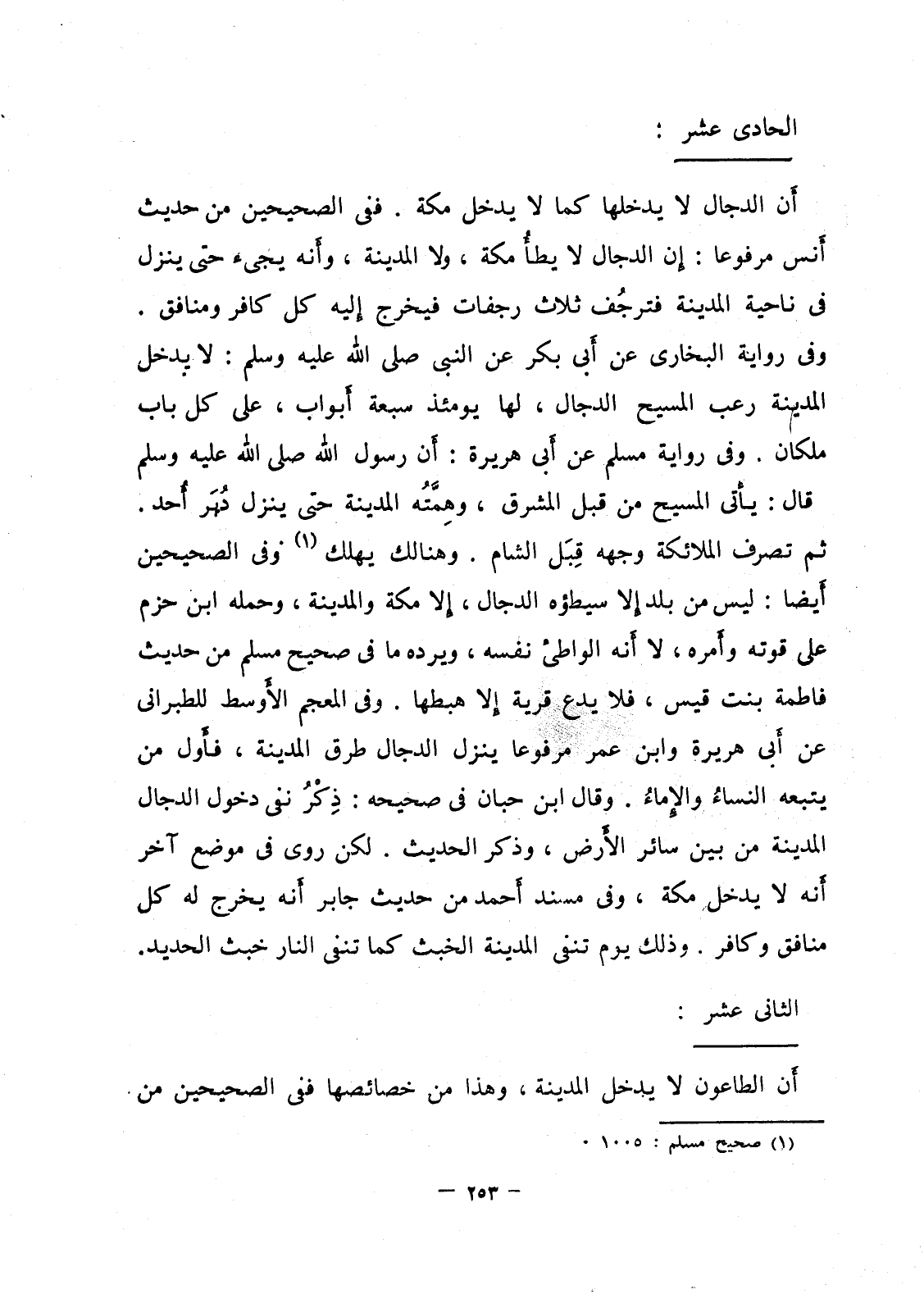 أَن الدجال لا يدخلها كما لا يدخل مكة. ففي الصحيحين من حديث أَنس مرفوعا: إن الدجال لا يطأُ مكة، ولا المدينة، وأنه يجيء حتى ينزل في ناحية المدينة فترجُف ثلاث رجفات فيخرج إليه كل كافر ومنافق. وفي رواية البخاري عن أبي بكر عن النبي صلى الله عليه وسلم: لا يدخل المدينة رعب المسيح الدجال، لها يومئذ سبعة أبواب، على كل باب ملكان. وفي رواية مسلم عن أبي هريرة: أن رسول الله صلى الله عليه وسلم قال: يأتي المسيح من قبل المشرق، وهمته المدينة حتى ينزل دُبَر أحد. ثم تصرف الملائكة وجهه قِبَل الشام. وهنالك يهلك وفي الصحيحين أَيضا: ليس من بلد إلا سيطؤه الدجال، إلا مكة والمدينة، وحمله ابن حزم على قوته وأمره، لا أنه الواطئ نفسه، ويرده ما في صحيح مسلم من حديث فاطمة بنت قيس، فلا يدع قرية إلا هبطها. وفي المعجم الأَوسط للطبراني عن أَبي هريرة وابن عمر مرفوعا ينزل الدجال طرق المدينة، فأَول من يتبعه النساء والإِماءُ. وقال ابن حبان في صحيحه: ذِكْرُ نفى دخول الدجال المدينة من بين سائر الأَرض، وذكر الحديث. لكن روى في موضع آخر أنه لا يدخل مكة، وفي مسند أحمد من حديث جابر أَنه يخرج له كل منافق وكافر. وذلك يوم تنفى المدينة الخبث كما تنفى النار خبث الحديد.