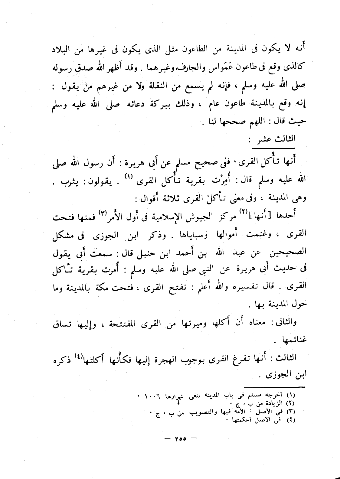 أحدها (أنها) مركز الجيوش الإسلامية في أَول الأَمر فمنها فتحت القرى، وغنمت أموالها وسباياها. وذكر ابن الجوزي في مشكل الصحيحين عن عبد الله بن أحمد ابن حنبل قال: سمعت أَبي يقول في حديث أبي هريرة عن النبي صلى الله عليه وسلم: أُمرت بقرية تأكل القرى. قال تفسيره والله أعلم: تفتح القرى، فتحت مكة بالمدينة وما حول المدينة بها.