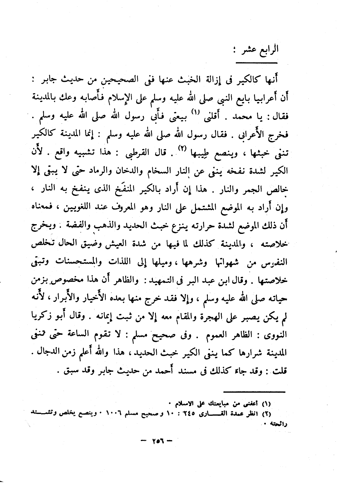 أَنها كالكير في إزالة الخبث عنها ففي الصحيحين من حديث جابر: أَن أَعرابيا بايع النبي صلى الله عليه وسلم على الإسلام فأَصابه وعك بالمدينة فقال: يا محمد. أَقلني بيعتي فأَبى رسول الله صلى الله عليه وسلم. فخرج الأَعرابي. فقال رسول الله صلى الله عيه وسلم: إنما المدينة كالكير تنفي خبثها، وينصع طيبها. قال القرطبي: هذا تشبيه واقع. لأَن الكير لشدة نفخه ينفي عن النار السخام والدخان والرماد حتى لا يبقى إلا خالص الجمر والنار. هذا إن أَراد بالكير المنفَخ الذي ينفخ به النار، وإن أراد به الموضع المشتمل على النار وهو المعروف عند اللغويين، فمعناه أَن ذلك الموضع لشدة حرارته ينزع خبث الحديد والذهب والفضة. ويخرج خلاصته، والمدينة كذلك لما فيها من شدة العيش وضيق الحال تخلص النفوس من شهواتها وشرهها، وميلها إلى اللذات والمستحسنات وتبقى خلاصتها. وقال ابن عبد البر في التمهيد: والظاهر أَن هذا مخصوص بزمن حياته صلى الله عليه وسلم، وإلا فقد خرج منها بعده الأَخيار والأَبرار، لأَنه لم يكن يصبر على الهجرة والمقام معه إلا من ثبت إيمانه. وقال أبو زكريا النووي: الظاهر العموم. وفي صحيح مسلم: لا تقوم الساعة حتى تنفى المدينة شرارها كما ينفي الكير خبث الحديد، هذا والله أعلم زمن الدجال. قلت: وقد جاءَ كذلك في مسند أَحمد من حديث جابر وقد سبق.
