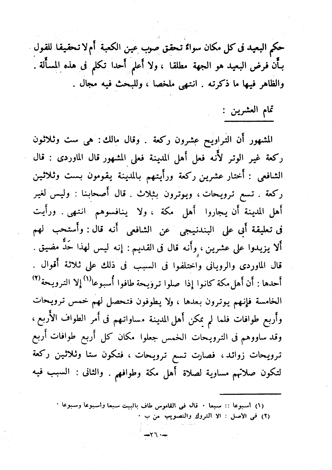 المشهور أن التراويح عشرون ركعة. وقال مالك: هي ست وثلاثون ركعة غير الوتر لأنه فعل أهل المدينة فعلى المشهور قال المارودي: قال الشافعي: أختار عشرين ركعة ورأَيتهم بالمدينة يقومون بست وثلاثين ركعة. ست ترويحات، ويوترون بثلاث. قال أصحابنا: وليس لغير أهل المدينة أن يجاروا أَهل مكة، ولا ينافسوهم انتهى. ورأَيت في تعليقة أبي على البندنيجي عن الشافعي أَنه قال: وأَستحب لهم ألا يزيدوا على عشرين، وأنه قال في القديم: إنه ليس لهذا حَدٌّ مضيق. قال المارودي والروياني واختلفوا في السبب في ذلك على ثلاثة أقوال. أحدها: أن أهل مكة كانوا إذا صلوا ترويحة طافوا أسبوعا إلا الترويحة الخامسة فإنهم يوترون بعدها، ولا يطوفون فتحصل لهم خمس ترويحات وأَربع طوافات فلما لم يمكن أَهل المدينة مساواتهم في أمر الطواف الأربع، وقد ساووهم في الترويحات الخمس جعلوا مكان كل أربع طوافات أربع ترويحات زوائد، فصارت تسع ترويحات، فتكون ستا وثلاثين ركعة لتكون صلاتهم مساوية لصلاة أهل مكة وطوافهم. والثاني: السبب فيه