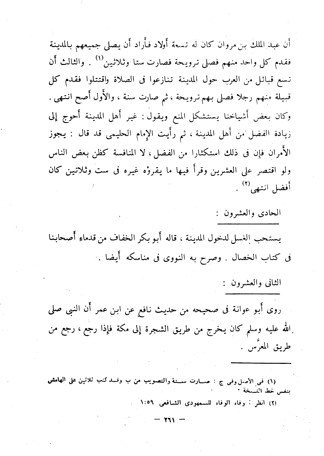 أن عبد الملك بن مروان كان له تسعة أولاد فأراد أن يصلي جميعهم بالمدينة فقدم كل واحد منهم فصلى ترويحة فصارت ستا وثلاثين. والثالث أن تسع قبائل من العرب حول المدينة تنازعوا في الصلاة واقتتلوا فقدم كل قبيلة منهم رجلا فصلى بهم ترويحة، ثم صارت سنة، والأول أصح انتهى. وكان بعض أشياخنا يستشكل المنع ويقول: غير أهل المدينة أحوج إلى زيادة الفضل من أهل المدينة، ثم رأيت الإمام الحليمي قد قال: يجوز الأمران فإن في ذلك استكثارا من الفضل، لا المنافسة كظن بعض الناس ولو اقتصر على العشرين وقرأَ فيها ما يقرؤه غيره في ست وثلاثين كان أفضل انتهى.