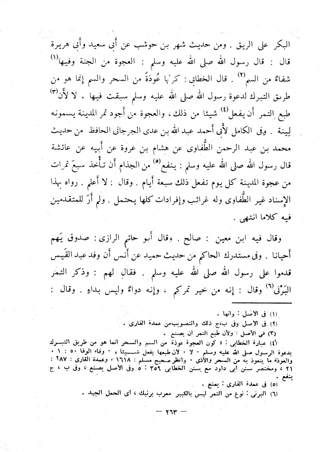 البكر على الريق، ومن حديث شهر بن حوشب عن أبي سعيد وأبي هريرة قال: قال رسول الله صلى الله عليه وسلم: العجوة من الجنة وفيها شفاءٌ من السم. قال الخطابي: كونها عوذةً من السحر والسم إنما هو من طريق التبرك لدعوة رسول الله صلى الله عليه وسلم سبقت فيها، لا لأن طبع التمر أن يفعل شيئا من ذلك، والعجوة من أجود تمر المدينة يسمونه لينة. وفي الكامل لأبي أحمد عبد الله بن عدي الجرجاني الحافظ من حديث محمد بن عبد الرحمن الطُّفاوي عن هشام بن عروة عن أبيه عن عائشة قال رسول الله صلى الله عليه وسلم: ينفع من الجذام أن تأخذ سبع تمرات من عجوة المدينة كل يوم تفعل ذلك سبعة أيام. وقال: لا أعلم. رواه بهذا الإسناد غير الطُّفاوي وله غرائب وإفرادات كلها يحتمل. ولم أرَ للمتقدمين فيه كلاما انتهى.