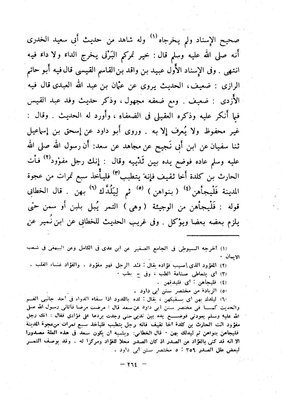 صحيح الإسناد ولم يخرجاه وله شاهد من حديث أبي سعيد الخدري أنه صلى الله عليه وسلم قال: خير تمركم البَرْني يخرج الداءَ ولا داءَ فيه انتهى. وفي الإسناد الأول عبيد بن واقد بن القاسم القيسي قال فيه أَبو حاتم الرازي: ضعيف. ومع ضعفه مجهول، وذكر حديث وفد عبد القيس فيما أنكر عليه وذكره العقيلي في الضعفاءِ، وأورد له الحديث. وقال: غير محفوظ ولا يُعرف إلا به. وروى أبو داود عن إسحق بن إسماعيل ثنا سفيان عن ابن أبي نجيح عن مجاهد عن سعد: أن رسول الله صلى الله عليه وسلم عاده فوضع يده بين ثدييه وقال: إنك رجل مفؤود فأت الحارث بن كلدة أخا ثقيف فإنه يتطبب فلياخذ سبع تمرات من عجوة المدينة فليجأهن (بنواهن) ثم ليلدك بهن. قال الخطابي قوله: فليجأهن من الوجيئة (وهي) التمر يُبل بلبن أو سمن حتى يلزم بعضه بعضا ويؤكل. وفي غريب الحديث للخطابي عن ابن نُمير عن
