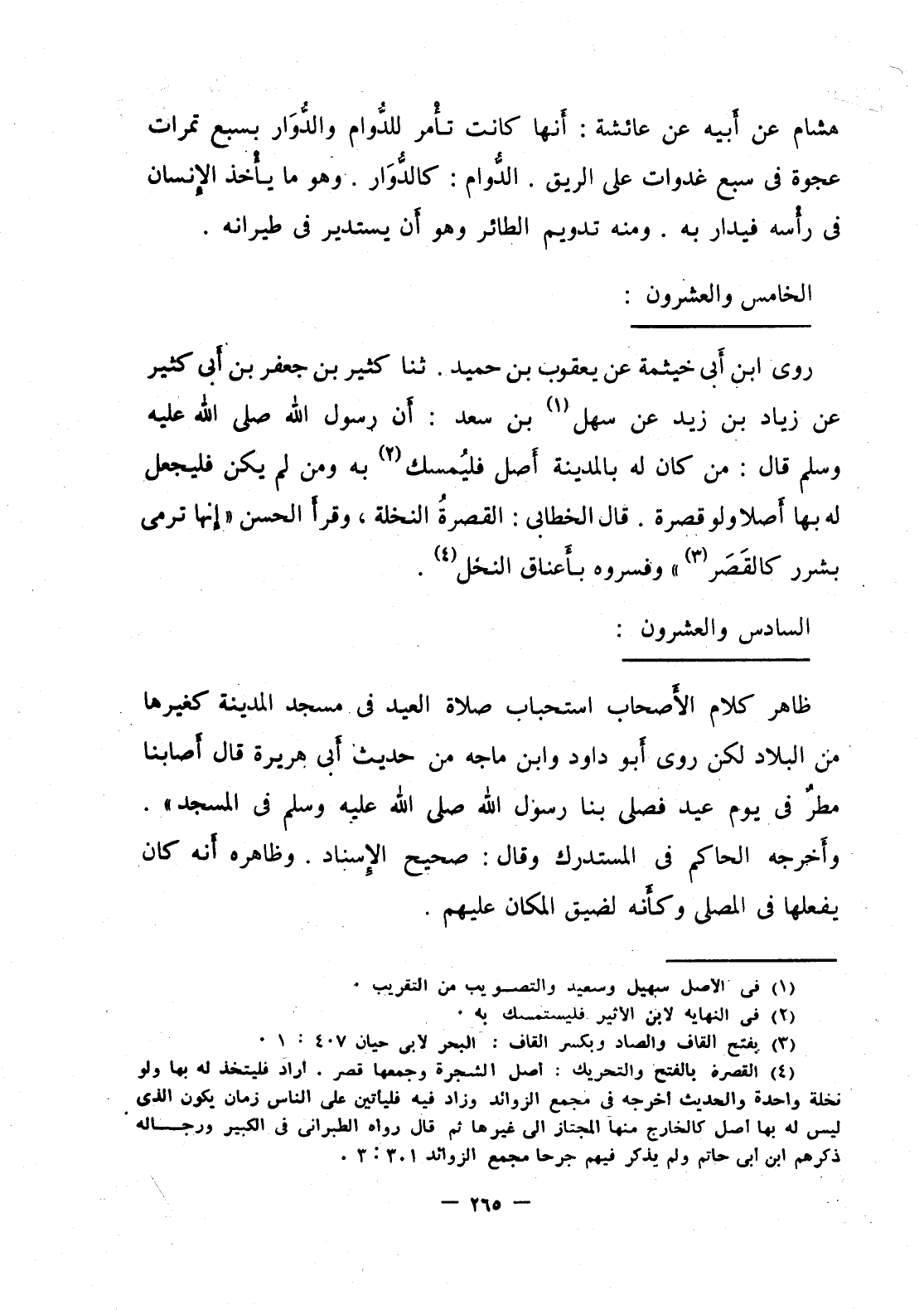 روى ابن أبي خيثمة عن يعقوب بن حميد. ثنا كثير بن جعفر بن أبي كثير عن زياد بن زيد عن سهل بن سعد: أن رسول الله صلى الله عليه وسلم قال: من كان له بالمدينة أصل فليُمسك به ومن لم يكن فليجعل له بها أَصلا ولو قصرة. وقال الخطابي: القصرةُ النخلة، وقرأ الحسن ((إنها ترمي بشرر كالقصر)) وفسروه بأعناق النخل.