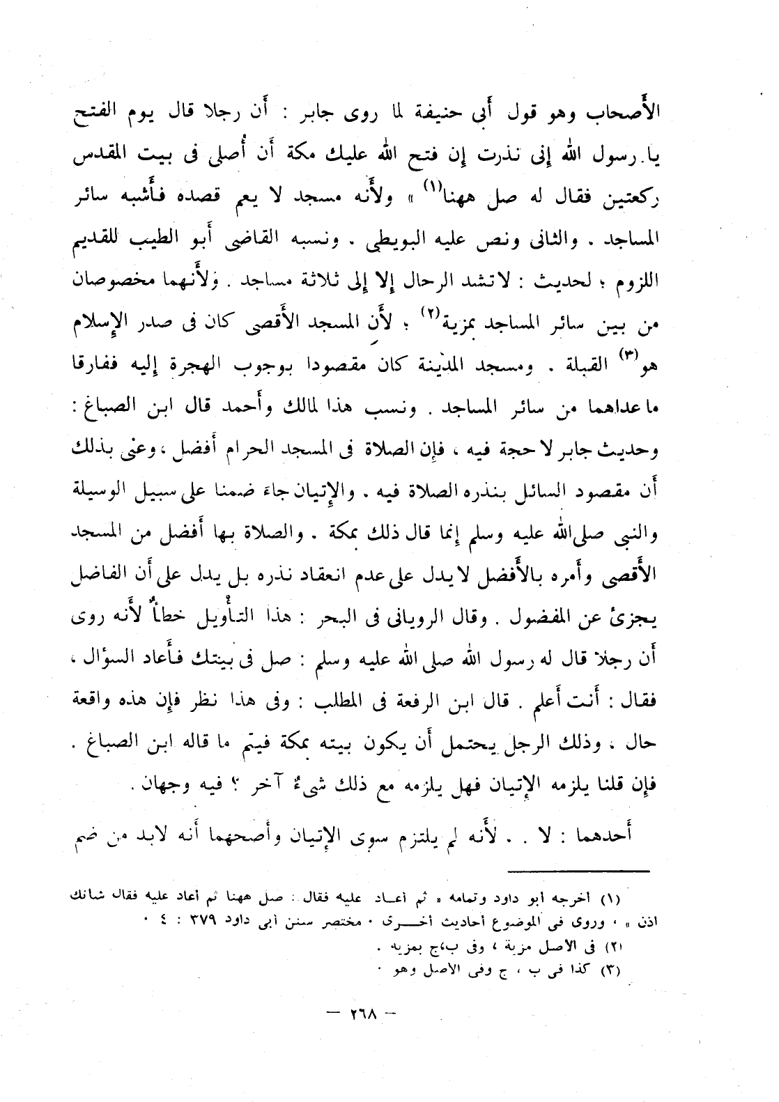 الأَصحاب وهو قول أبي حنيفة لما روى جابر: أن رجلا قال يوم الفتح يا رسول الله إني نذرت إن فتح الله عليك مكة أن أُصلي في بيت المقدس ركعتين فقال له صل ههنا " ولأنه مسجد لا يعم قصده فأشبه سائر المساجد. والثاني ونص عليه البويطي. ونسبه القاضي أبو الطيب للقديم اللزوم؛ لحديث: لا تشد الرحال إلا إلى ثلاثة مساجد. ولأنهما مخصوصان من بين سائر المساجد بمزية؛ لأَن المسجد الأَقصى كان في صدر الإسلام هو القبلة. ومسجد المدينة كان مقصودا بوجوب الهجرة إليه ففارقا ما عداهما من سائر المساجد. ونسب هذا لمالك وأَحمد قال ابن الصباغ: وحديث جابر لا حجة فيه، فإن الصلاة في المسجد الحرام أفضل، وعنى بذلك أن مقصود السائل بنذره الصلاة فيه، والإتيان جاءَ ضمنا على سبيل الوسيلة والنبي صلى الله عليه وسلم إنما قال ذلك بمكة، والصلاة بها أَفضل من المسجد الأقصى وأَمره بالأفضل لا يدل على عدم انعقاد نذره بل يدل على أن الفاضل يجزئ عن المفضول. وقال الروياني في البحر: هذا التأويل خطأٌ لأنه روى أن رجلاً قال له رسول الله صلى الله عليه وسلم: صل في بيتك فأعاد السؤال، فقال: أنت أعلم. قال ابن الرفعة في المطلب: وفي هذا نظر فإن هذه واقعة حال، وذلك الرجل يحتمل أن يكون بيته بمكة فيتم ما قاله ابن الصباغ. فإن قلنا يلزمه الإتيان فهل يلزمه مع ذلك شيءٌ آخر؟ فيه وجهان.