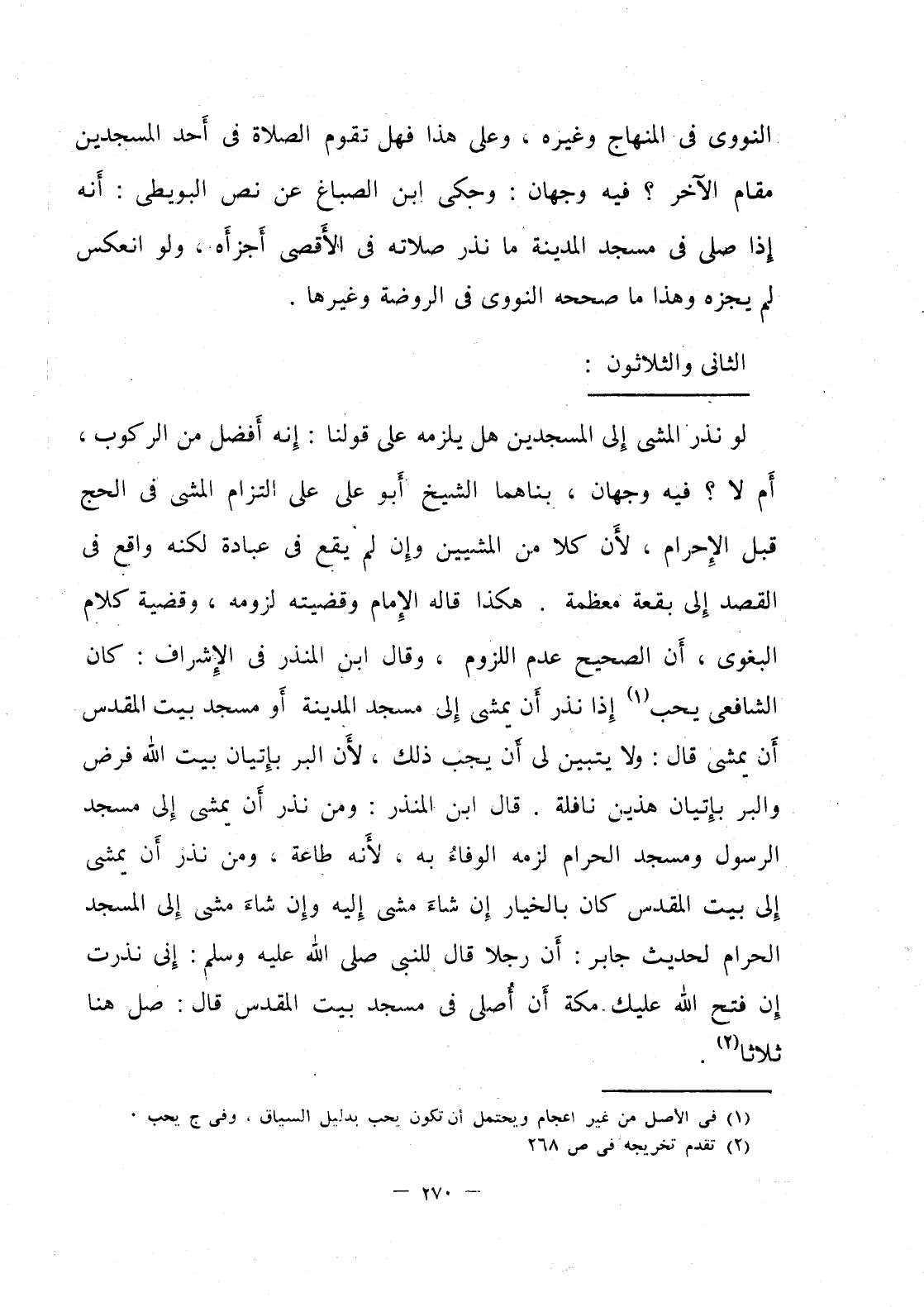النووي في المنهاج وغيره، وعلى هذا فهل تقوم الصلاة في أحد المسجدين مقام آخر؟ فيه وجهان: وحكى ابن الصباغ عن نص البويطي: أنه إذا صلى في مسجد المدينة ما نذر صلاته في الأقصى أجزأه، ولو انعكس لم يجزه وهذا ما صححه النووي في الروضة وغيرها.